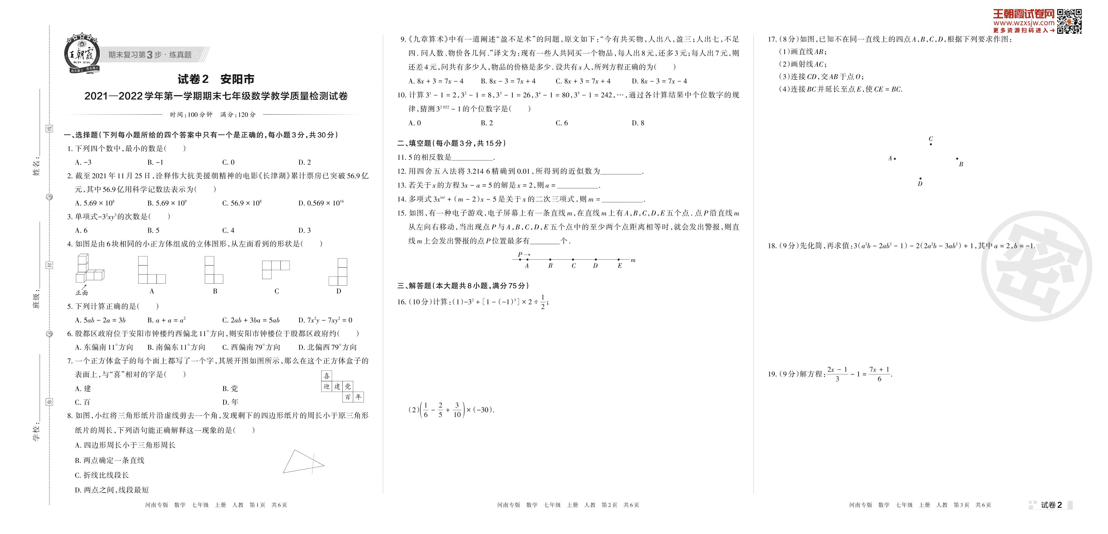 安阳市2021—2022学年第一学期期末七年级数学教学质量检测试卷(人教版)【2】