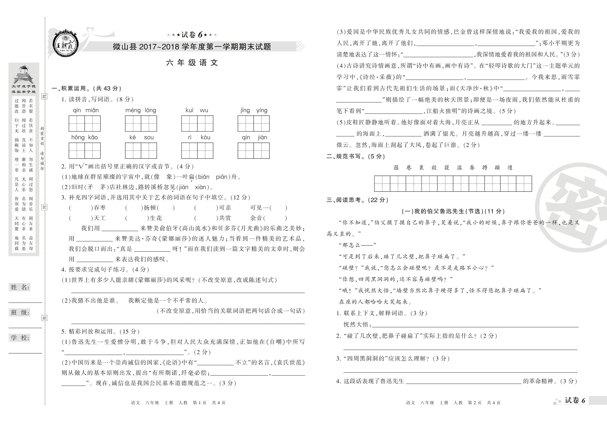 2017-2018学年第一学期济宁市微山县六年级语文试卷(人教版)【6】