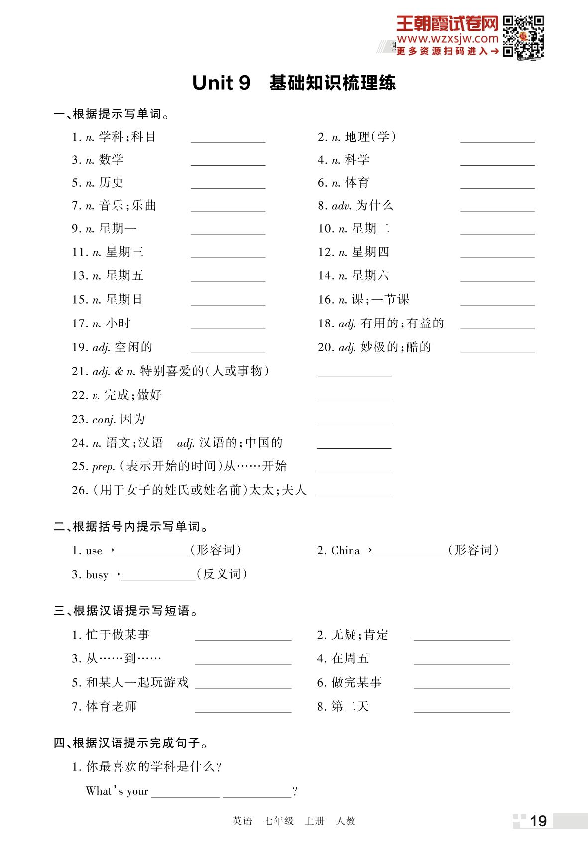 王朝霞期末过课本——Unit 9 基础知识梳理练七年级上册英语(人教版)