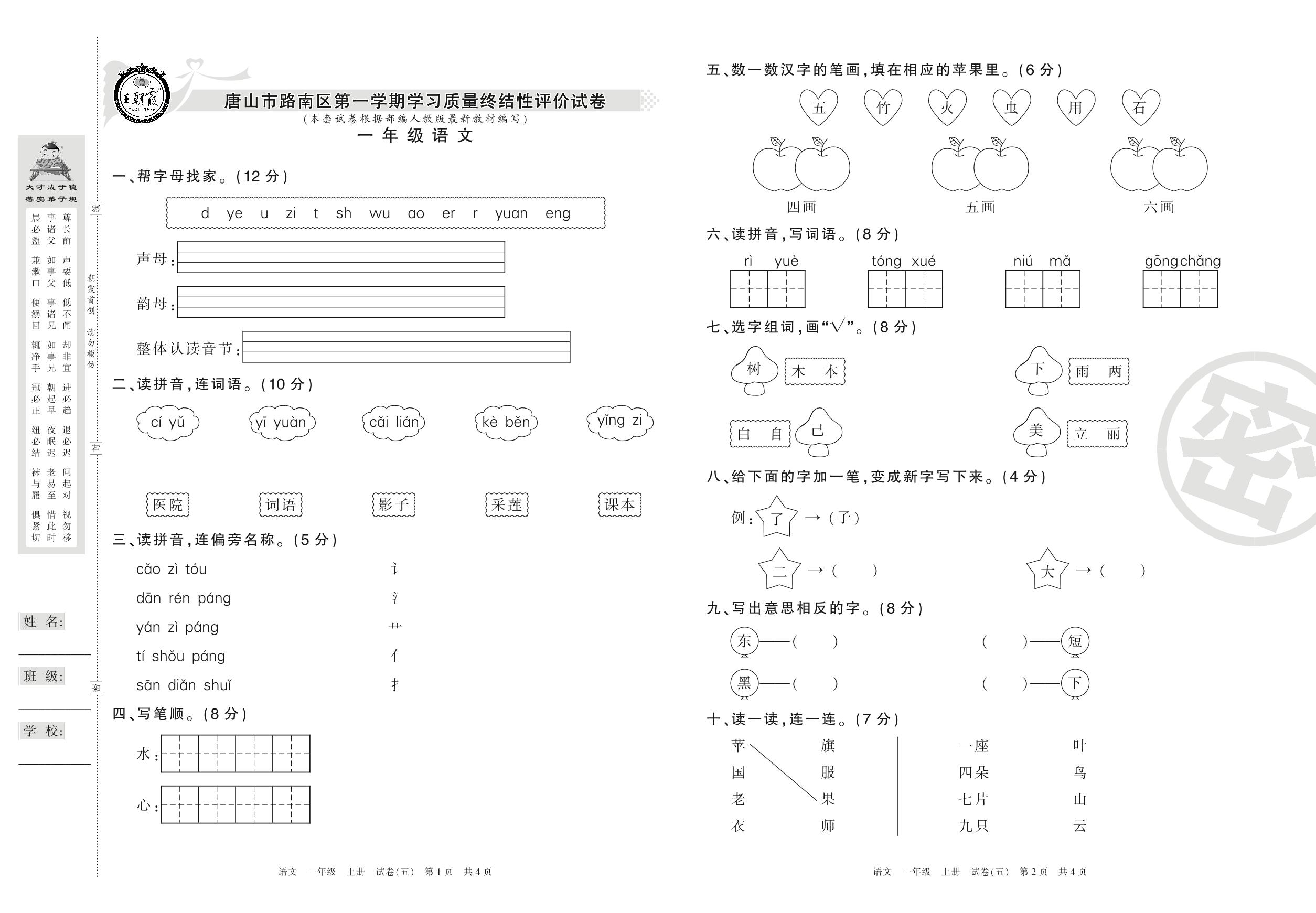 2016-2017学年第一学期唐山市路南区一年级语文试卷(人教版)【5】