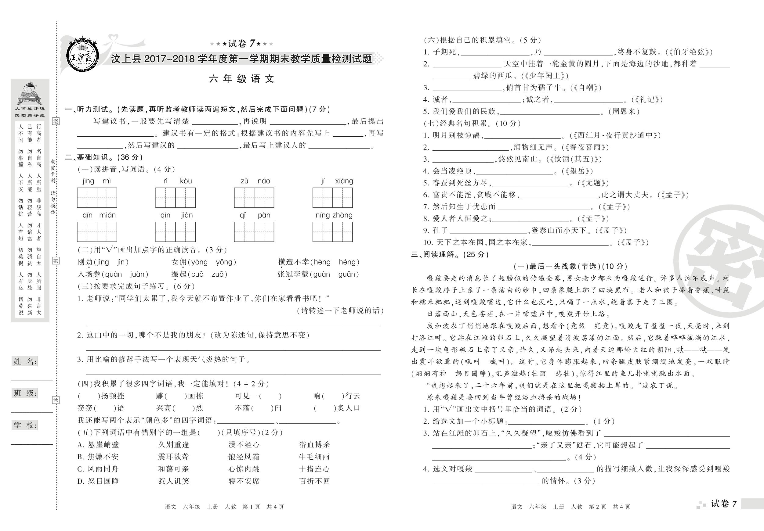 2017-2018学年第一学期济宁市汶上县六年级语文试卷(人教版)【7】