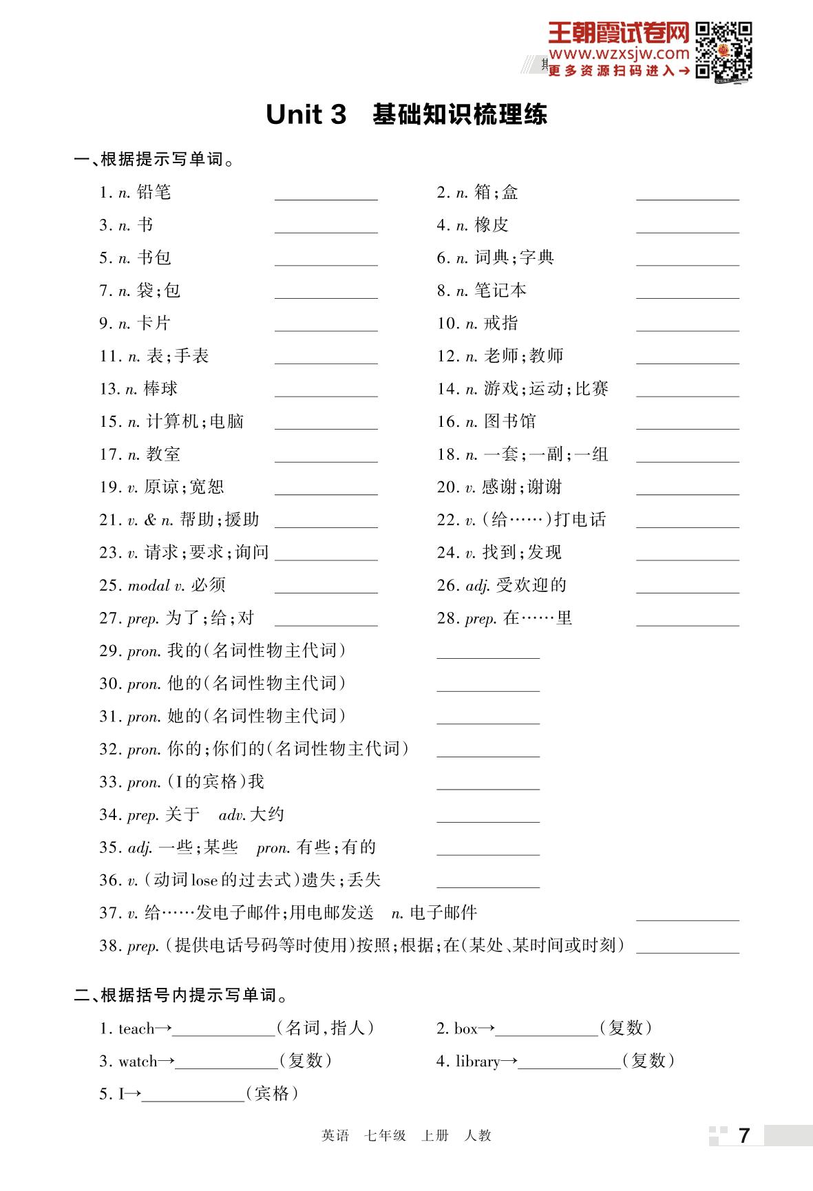 王朝霞期末过课本——Unit 3 基础知识梳理练七年级上册英语(人教版)