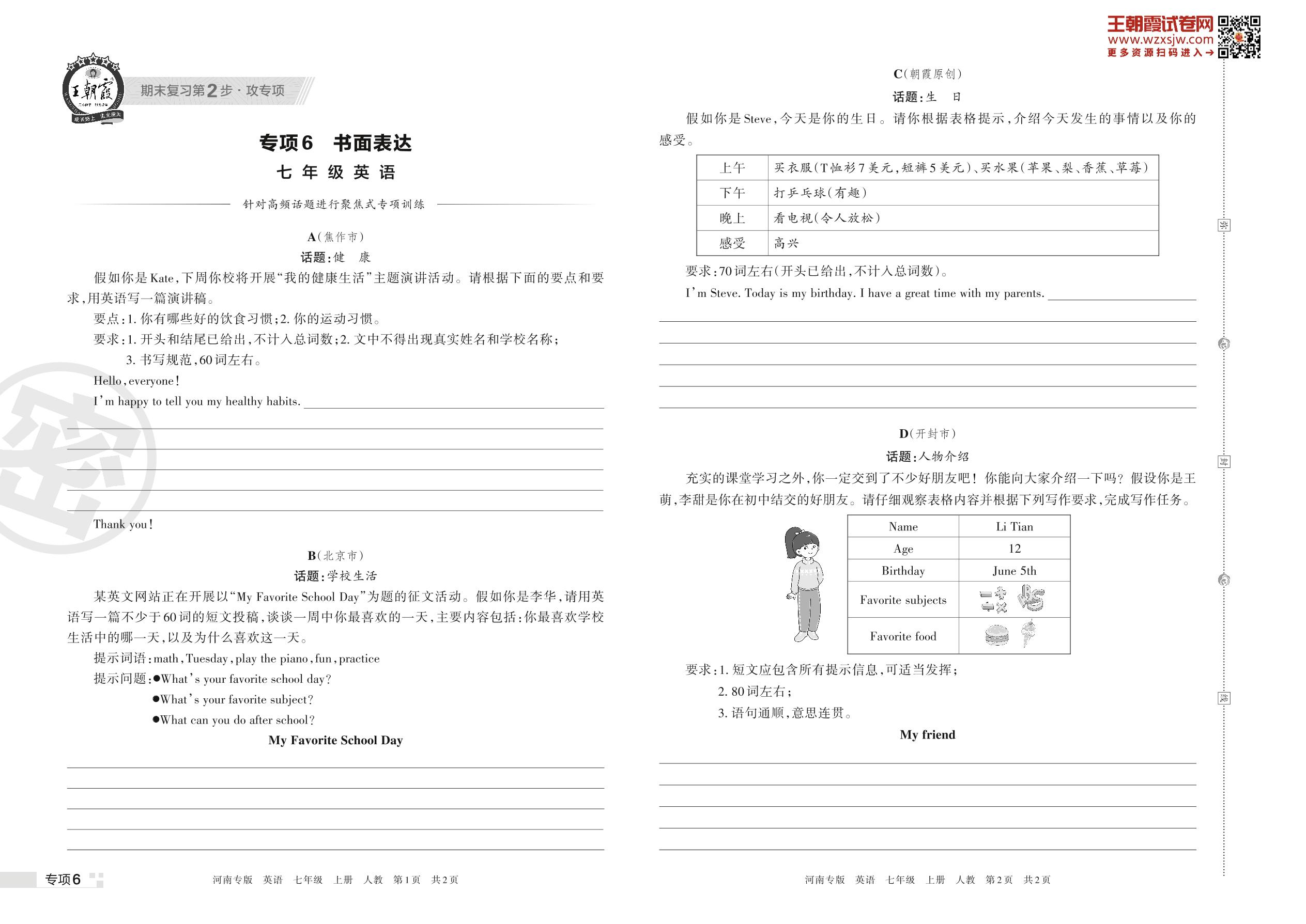 【易考专项】PEP版·英语·七年级书面表达专项训练
