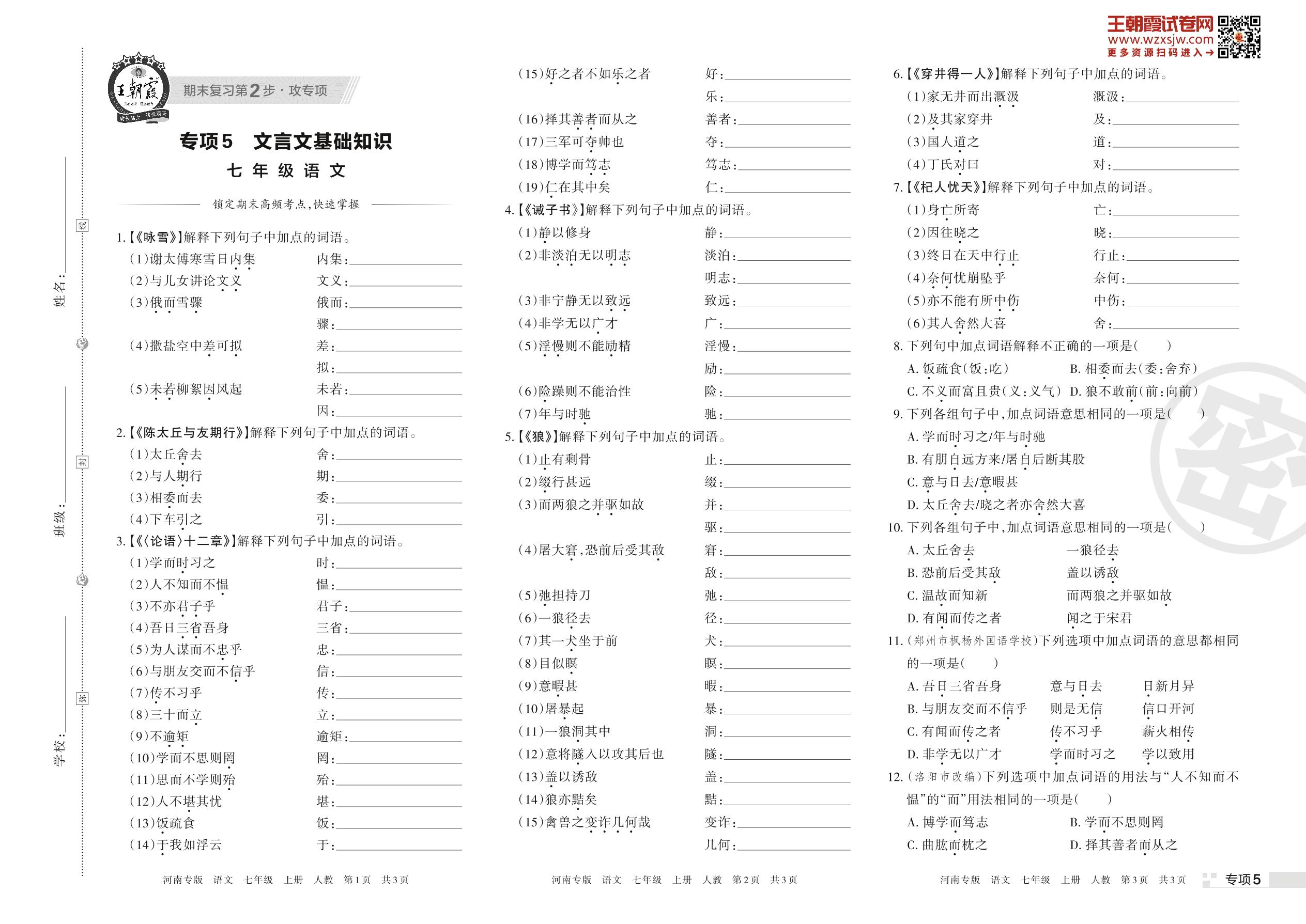 王朝霞期末专项卷——文言文基础知识七年级上册语文(人教版)【5】