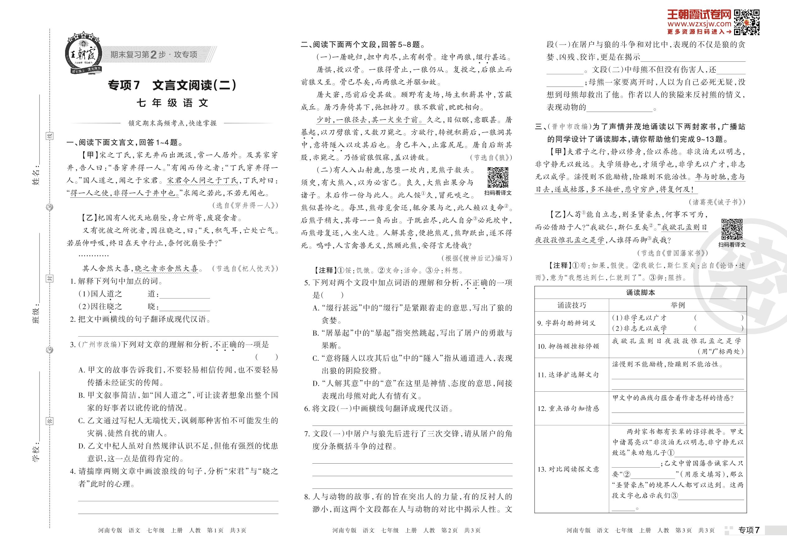 【易考专项】人教版·语文·七年级文言文阅读(二)专项训练