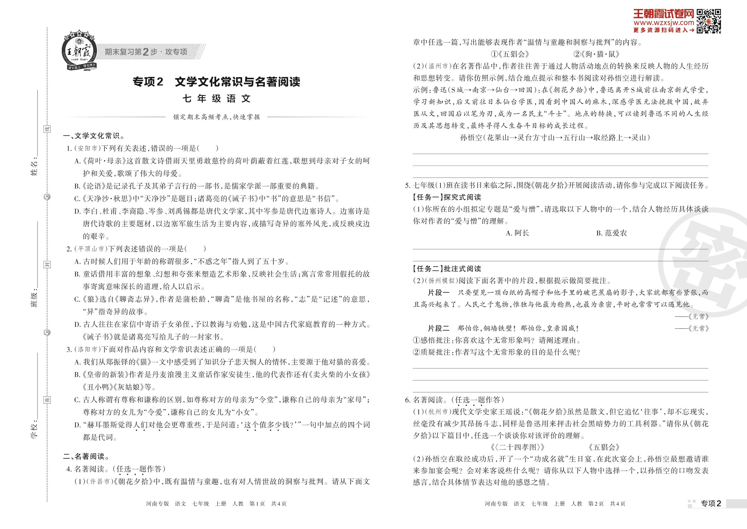 王朝霞期末专项卷——文学文化常识与名著阅读七年级上册语文(人教版)【2】