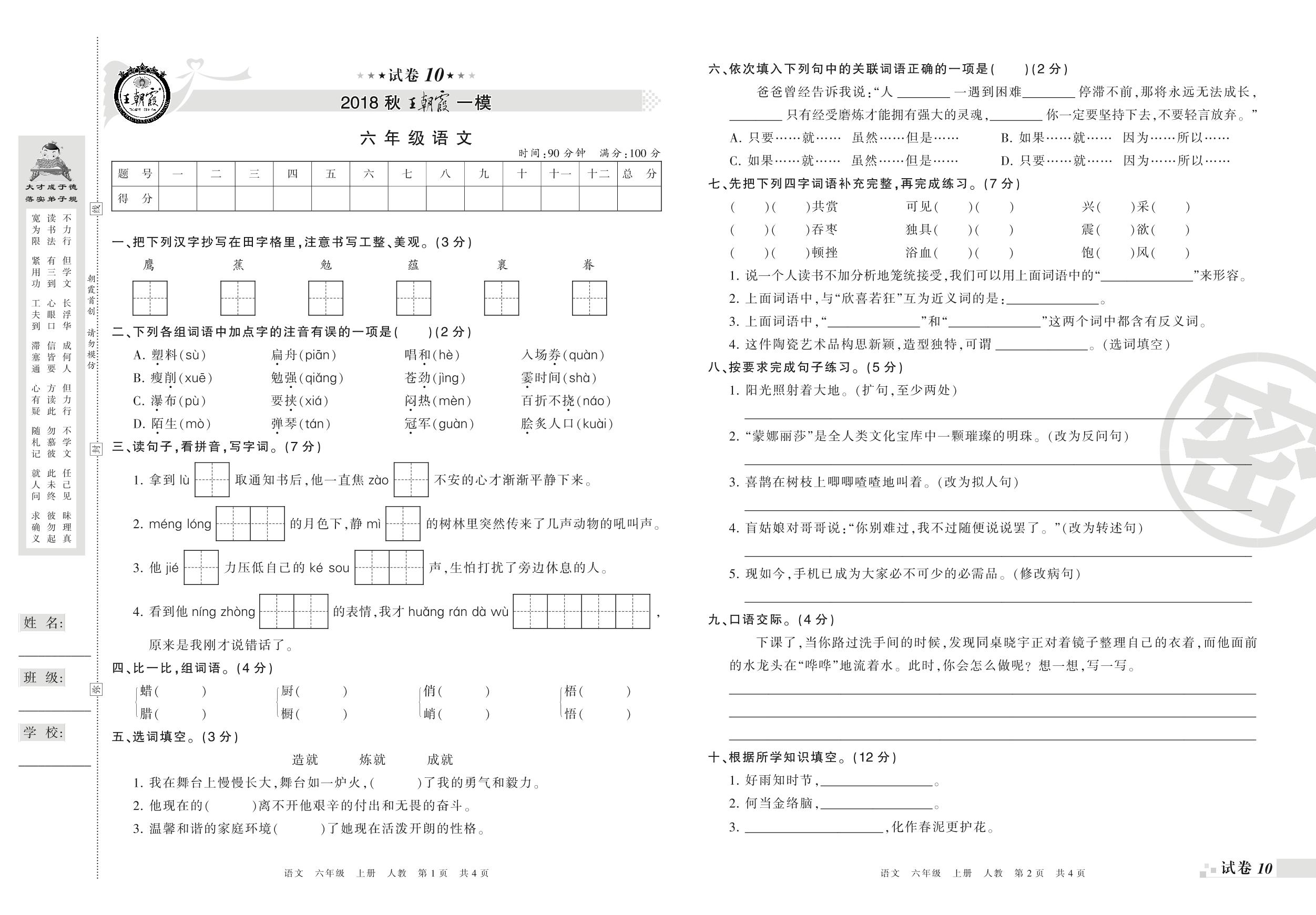王朝霞期末模拟卷六年级上册语文(人教版)_R210802114243【10】