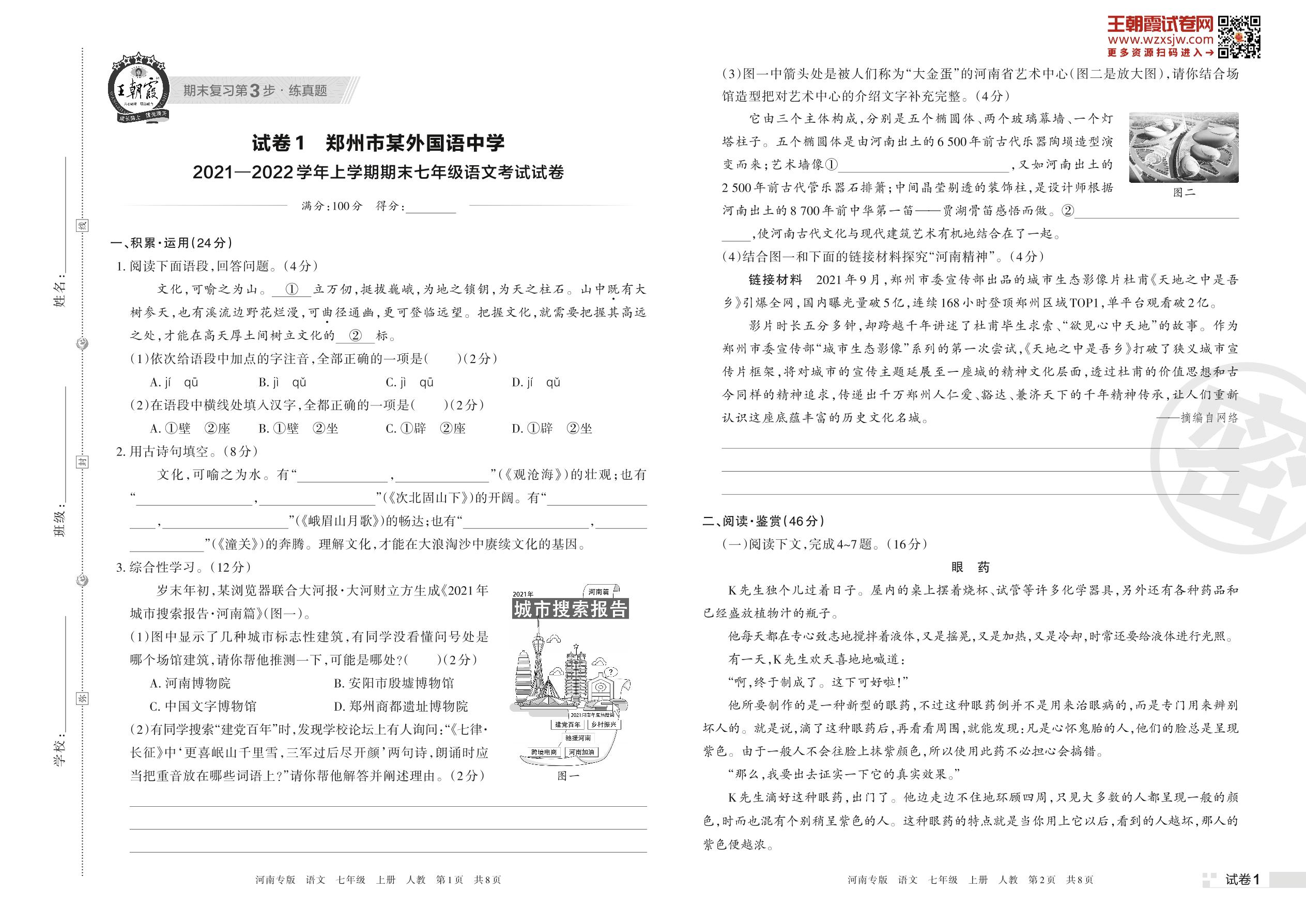 郑州市某外国语中学2021—2022学年上学期期末七年级语文考试试卷(人教版)【1】