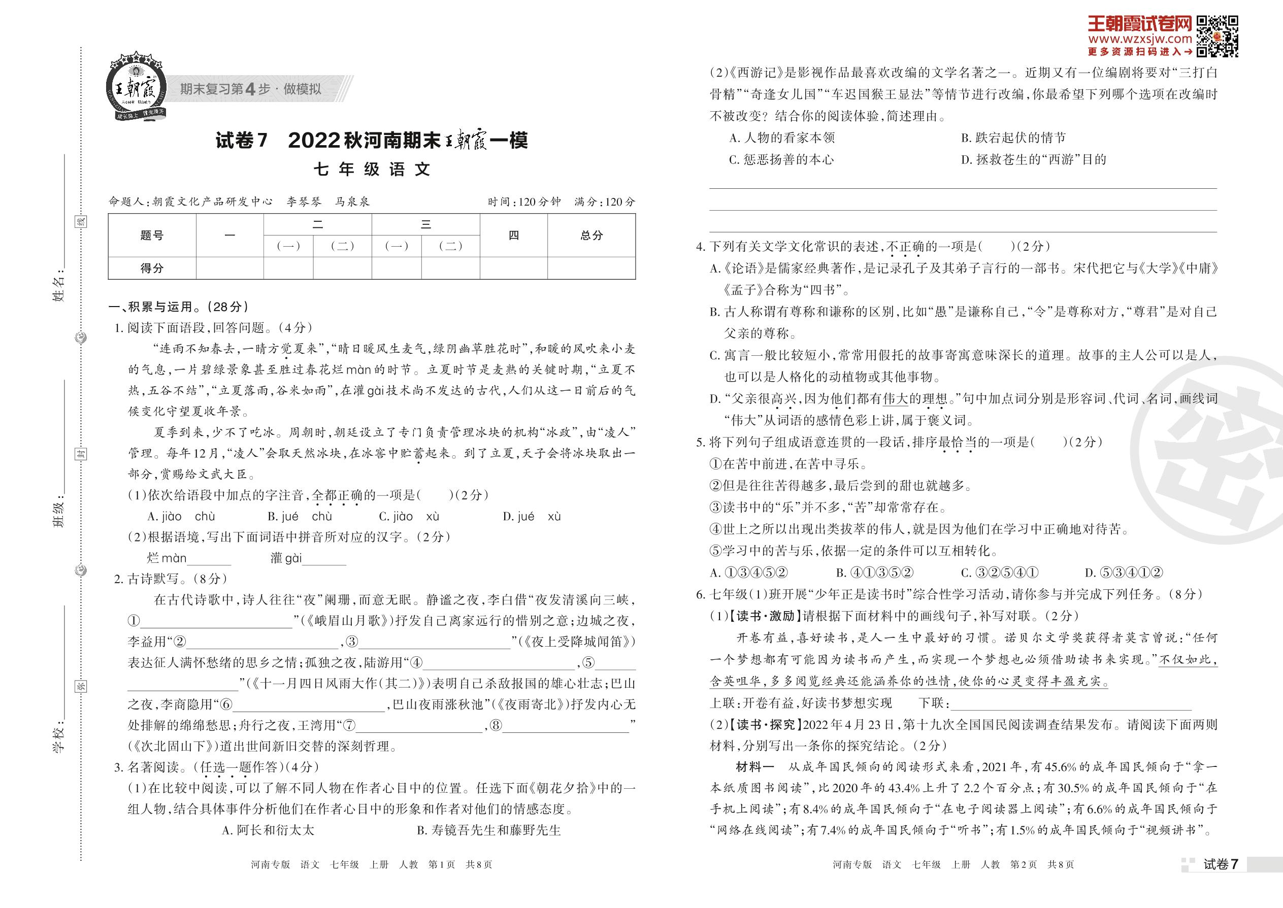 王朝霞期末模拟卷七年级上册语文(人教版)_R221116160512550【7】