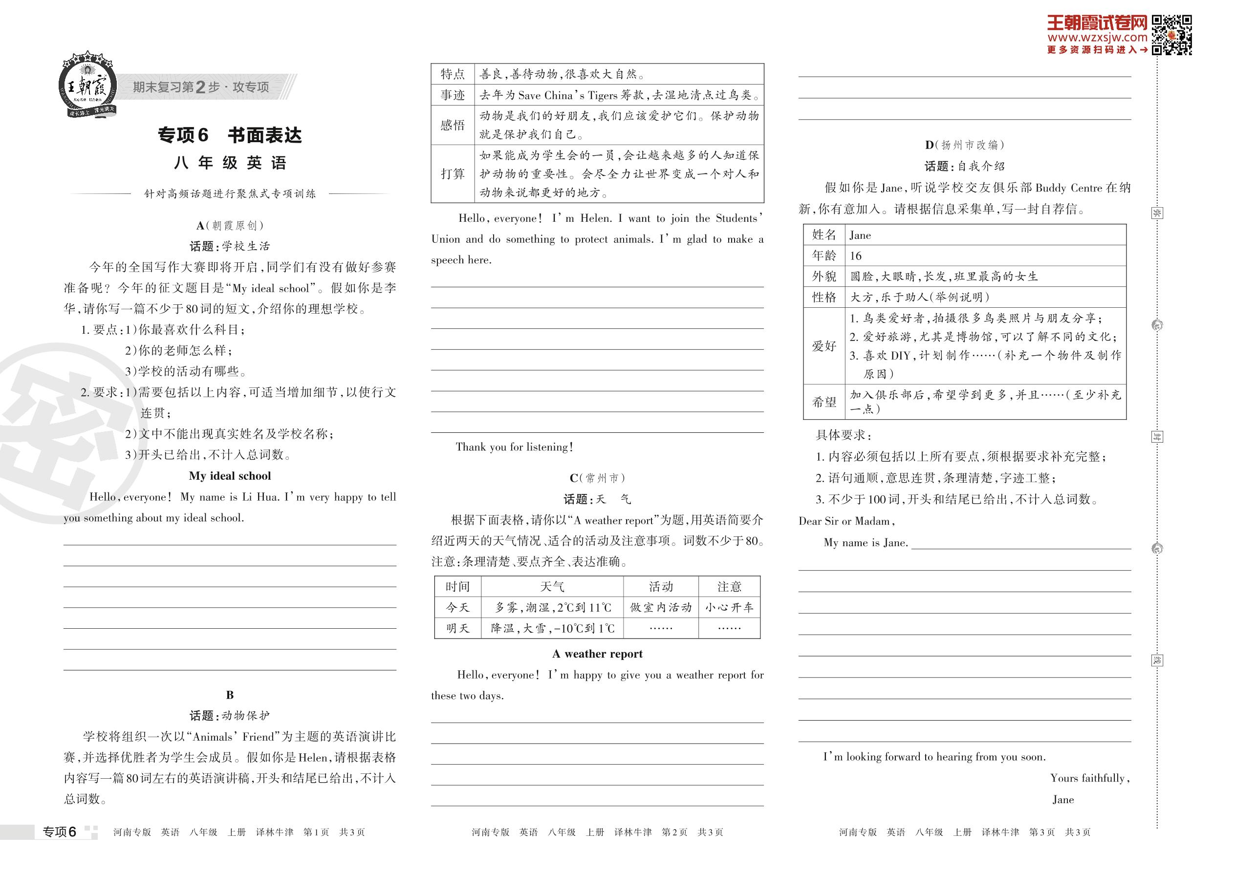 王朝霞期末专项卷——书面表达八年级上册英语(译林牛津版)【6】