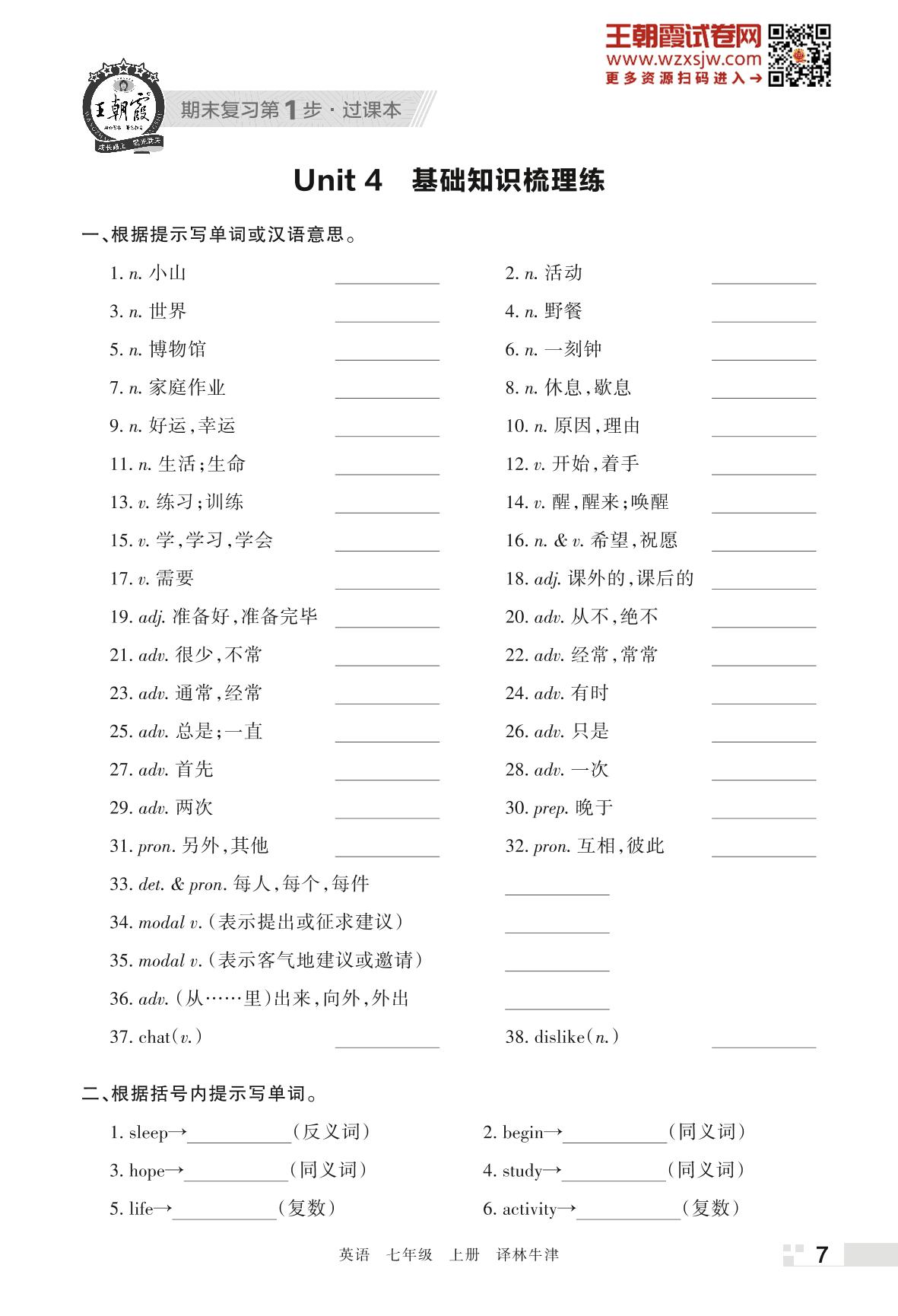 王朝霞期末过课本——Unit 4 基础知识梳理练七年级上册英语(译林牛津版)