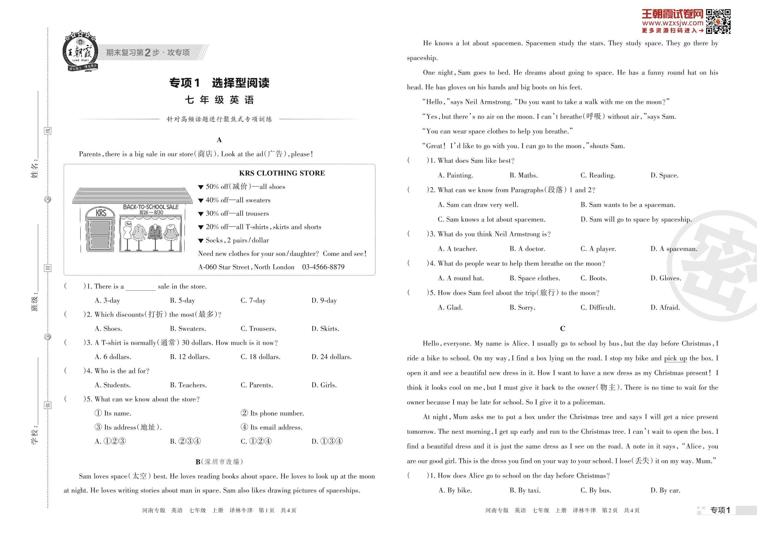 王朝霞期末专项卷——选择型阅读七年级上册英语(译林牛津版)【1】