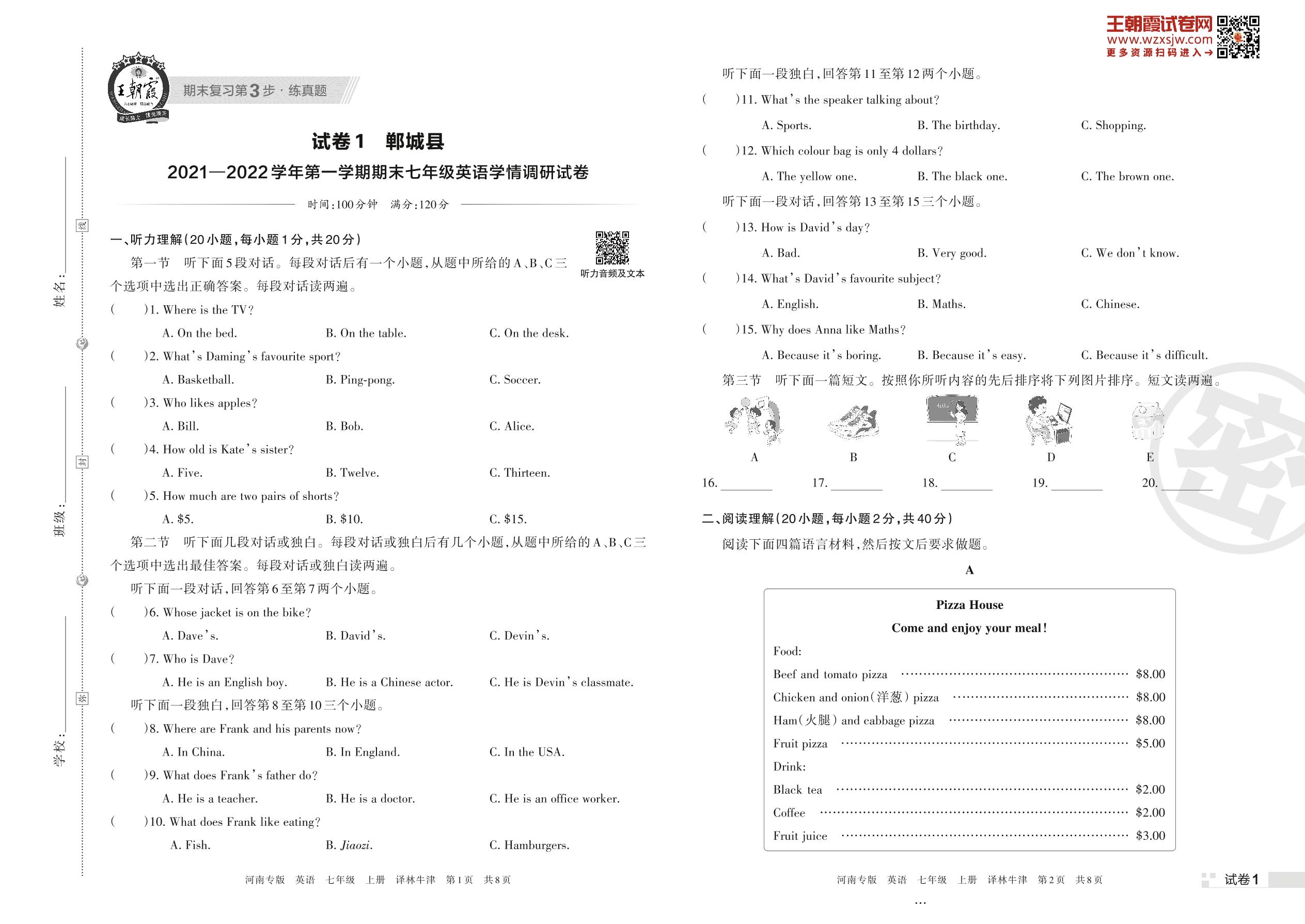 郸城县2021—2022学年第一学期期末七年级英语学情调研试卷(译林牛津版)【1】