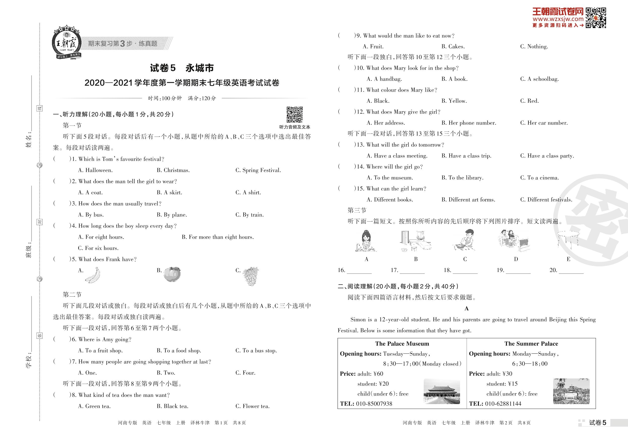 永城市2020—2021学年度第一学期期末七年级英语考试试卷 (译林牛津版)【5】