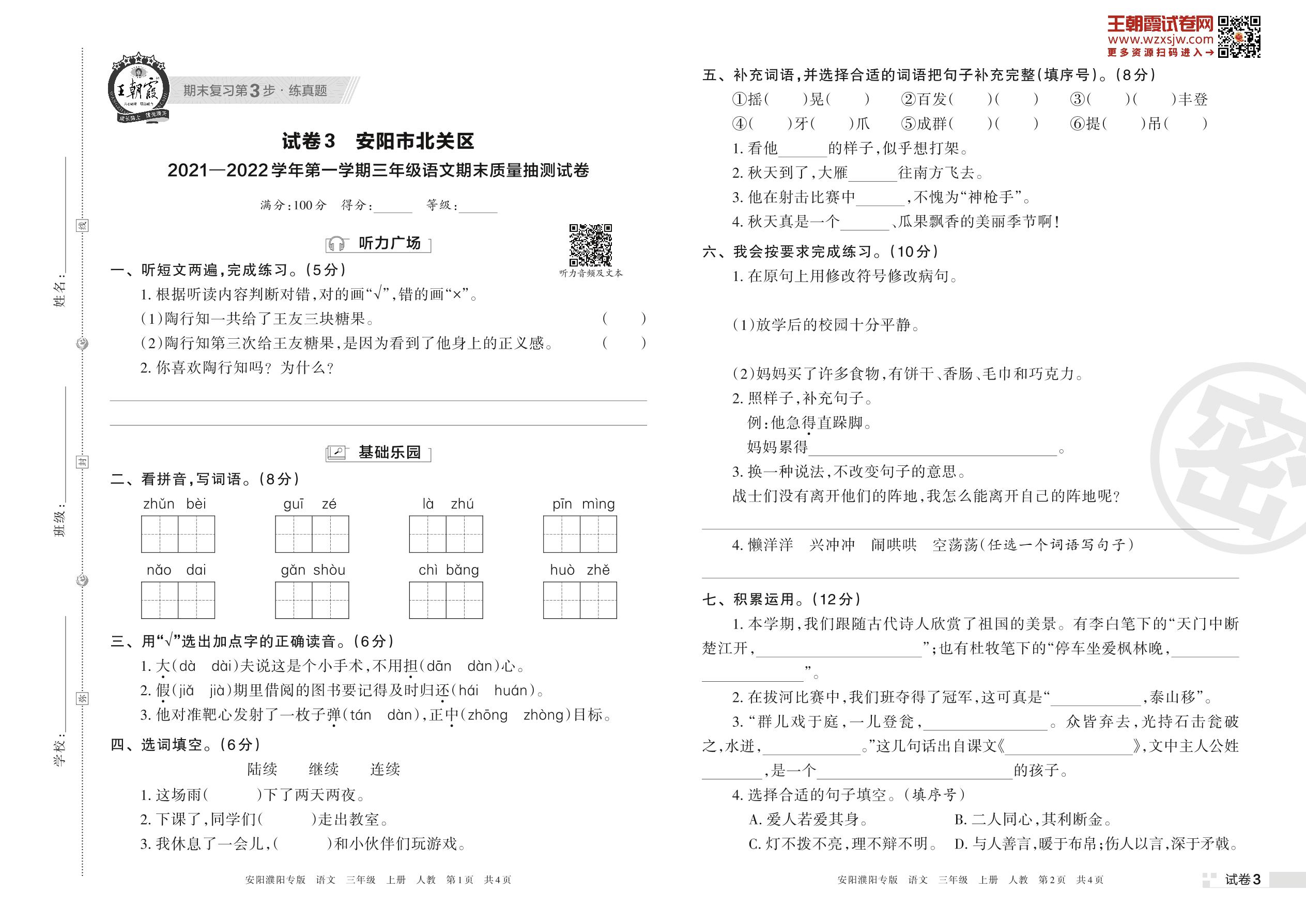 安阳市北关区2021—2022学年第一学期三年级语文期末质量抽测试卷(人教版)【3】