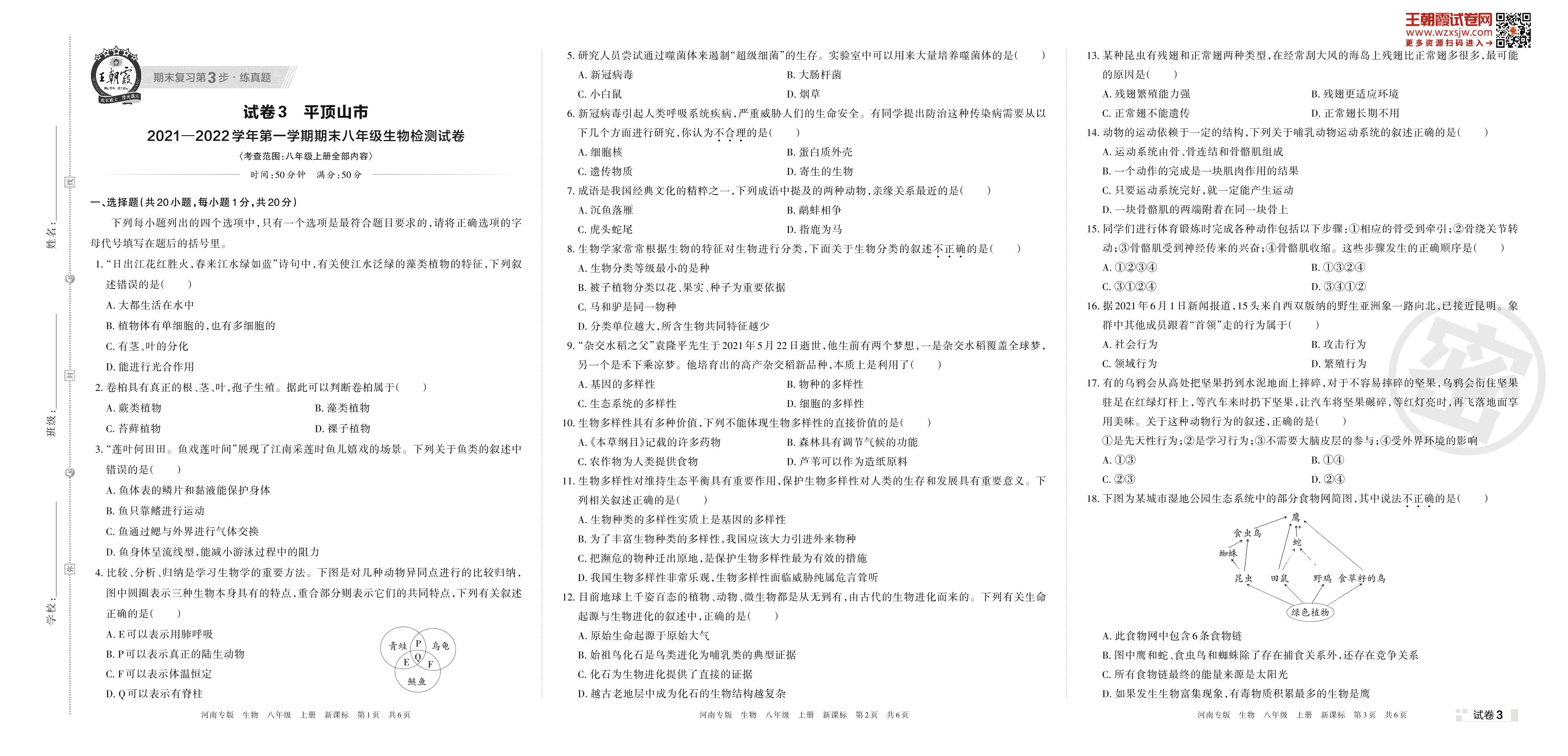 平顶山市2021—2022学年第一学期期末八年级生物检测试卷(新课标版)【3】
