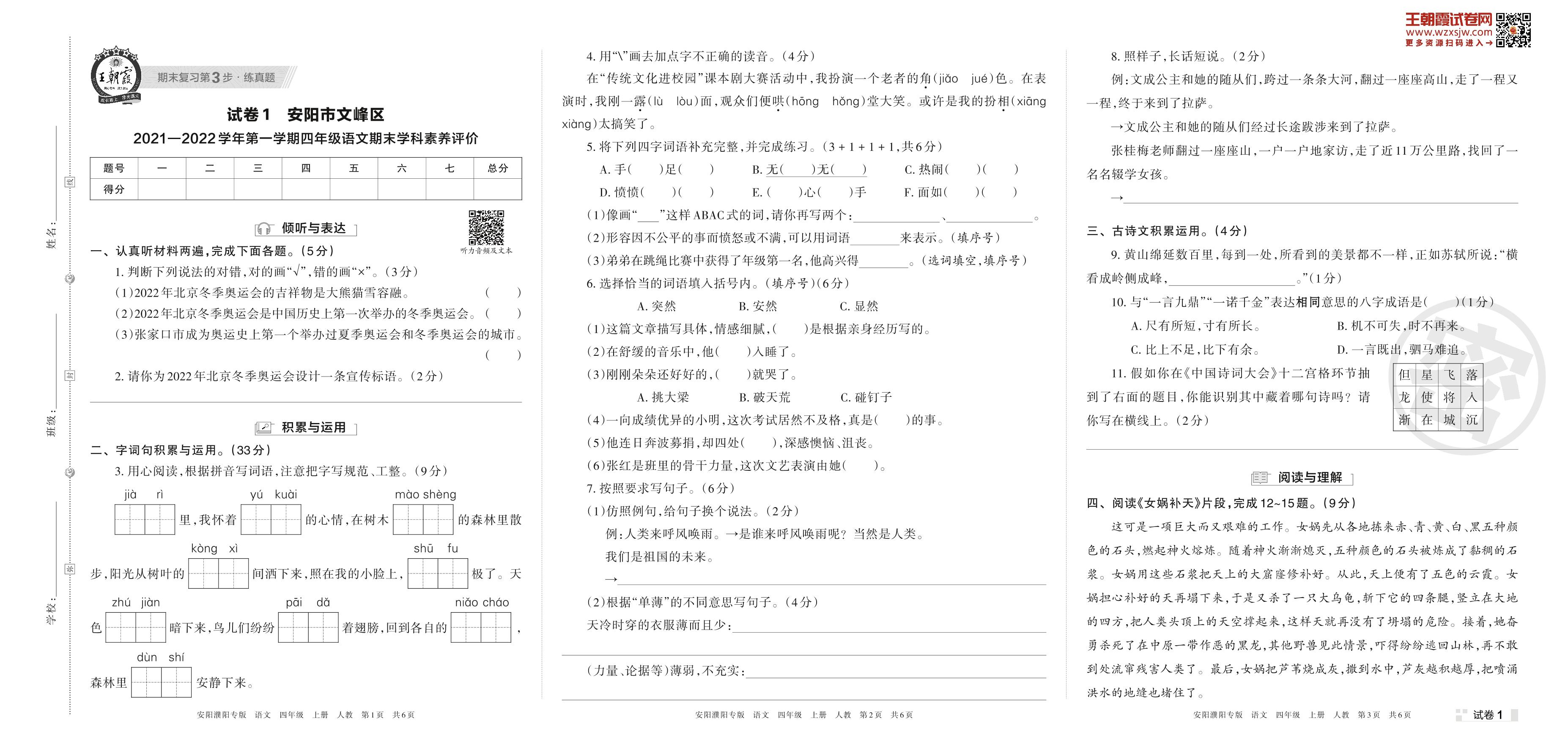 安阳市文峰区2021—2022学年第一学期四年级语文期末学科素养评价(人教版)【1】