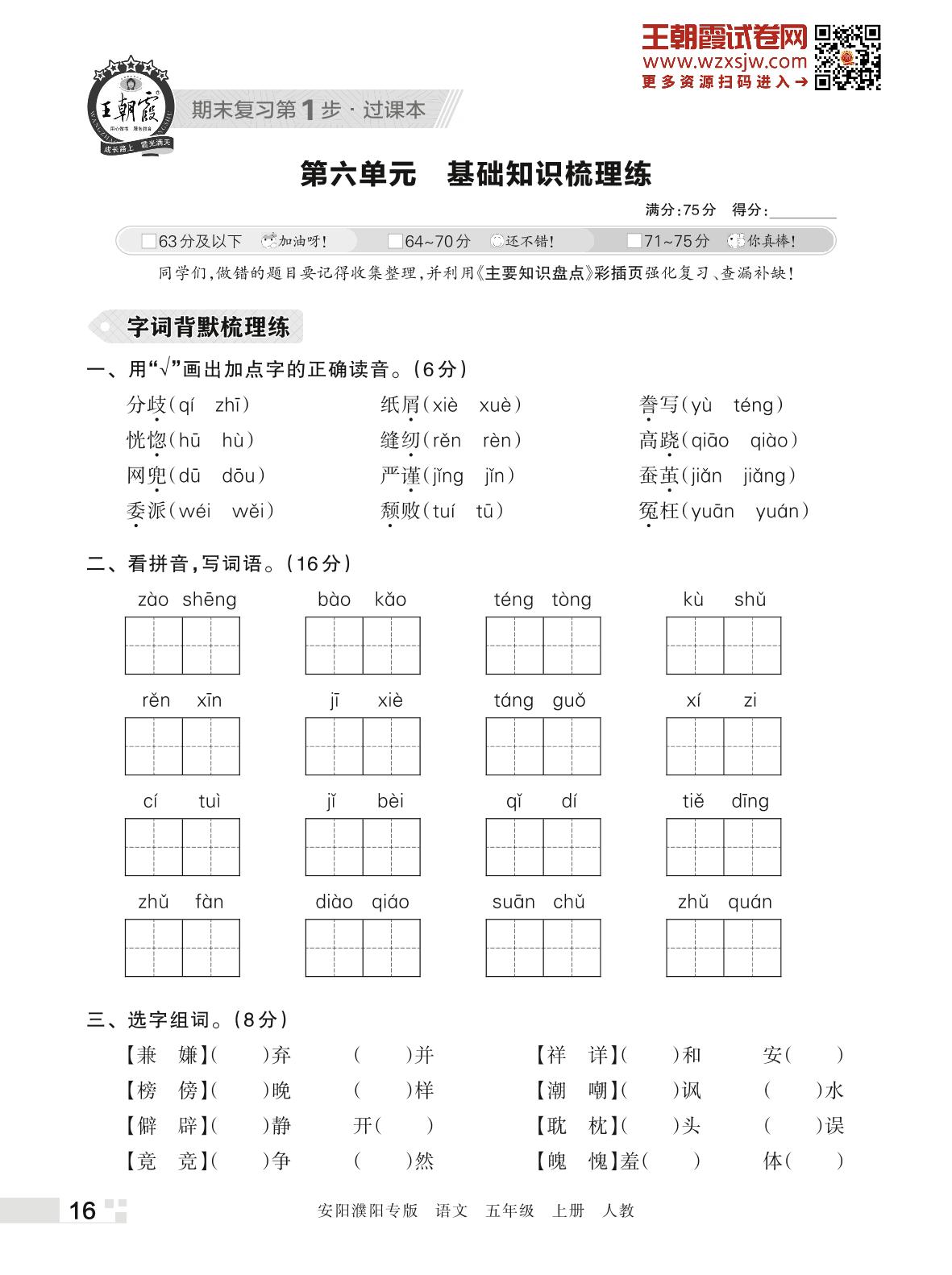 王朝霞期末过课本——第六单元 基础知识梳理练五年级上册语文(人教版)_R221116171723341