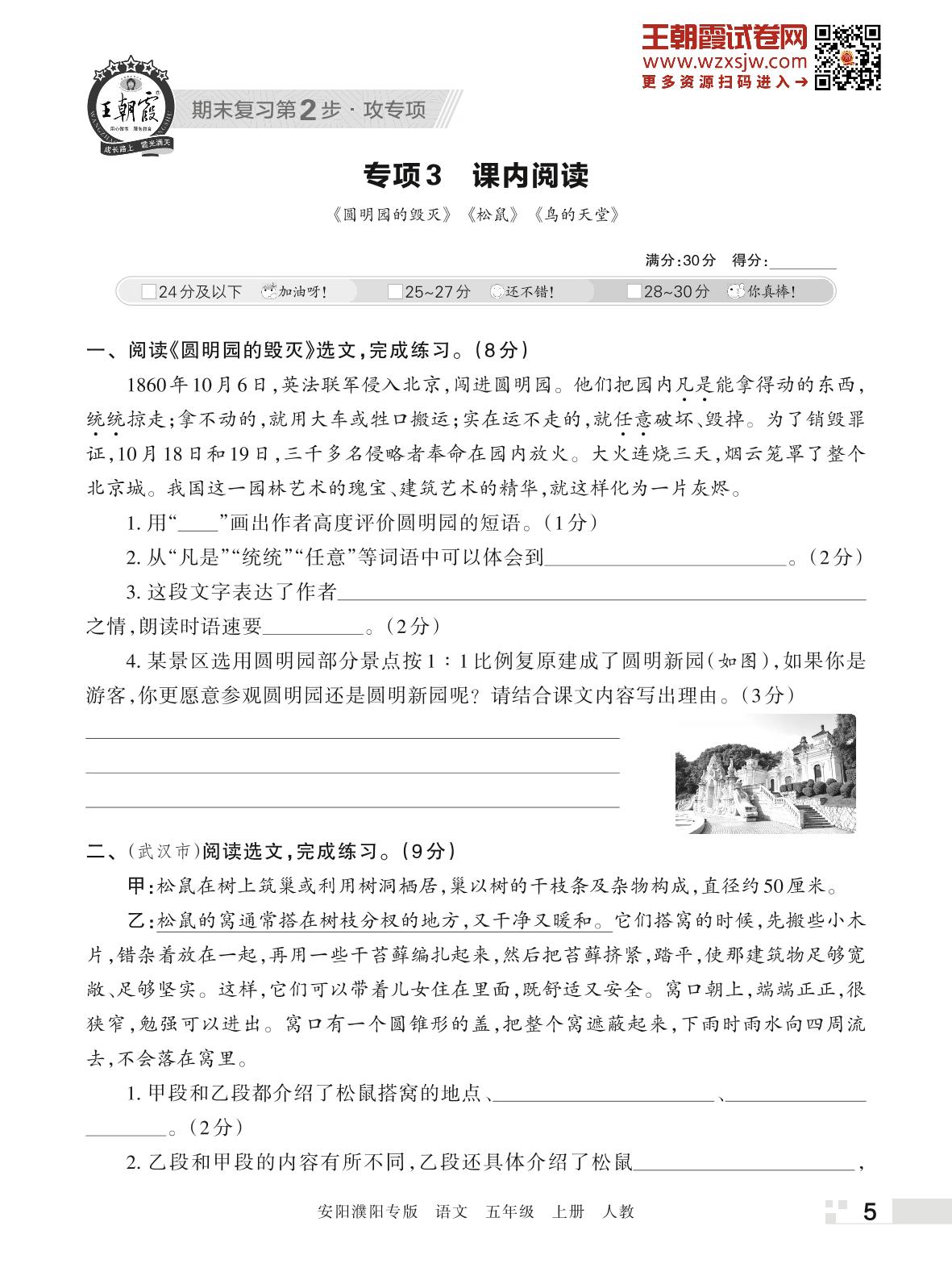 王朝霞期末专项卷——课内阅读五年级上册语文(人教版)_R221116171724931【3】