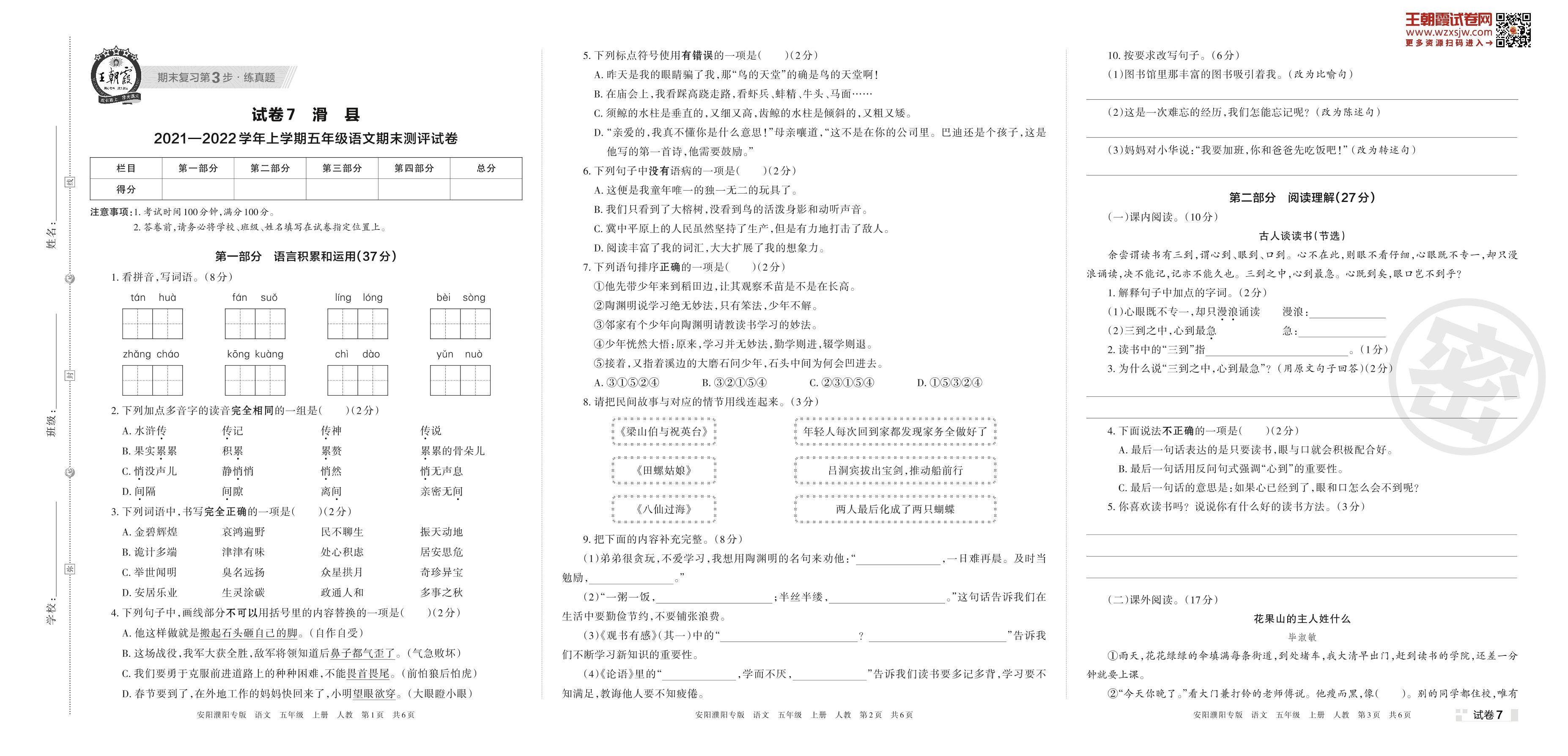 滑县2021—2022学年上学期五年级语文期末测评试卷(人教版)【7】