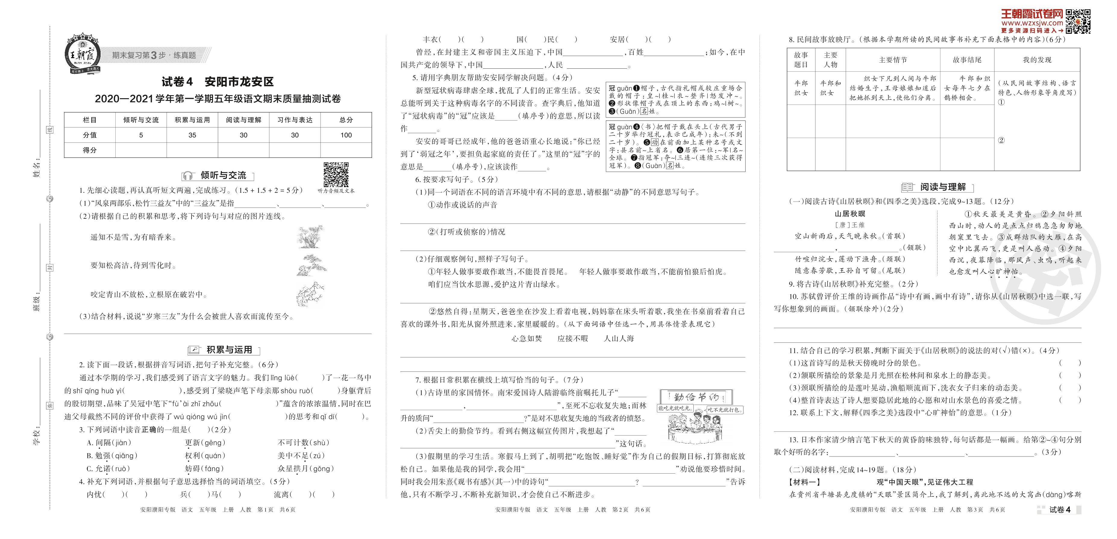 安阳市龙安区2020—2021学年第一学期五年级语文期末质量抽测试卷(人教版)【4】