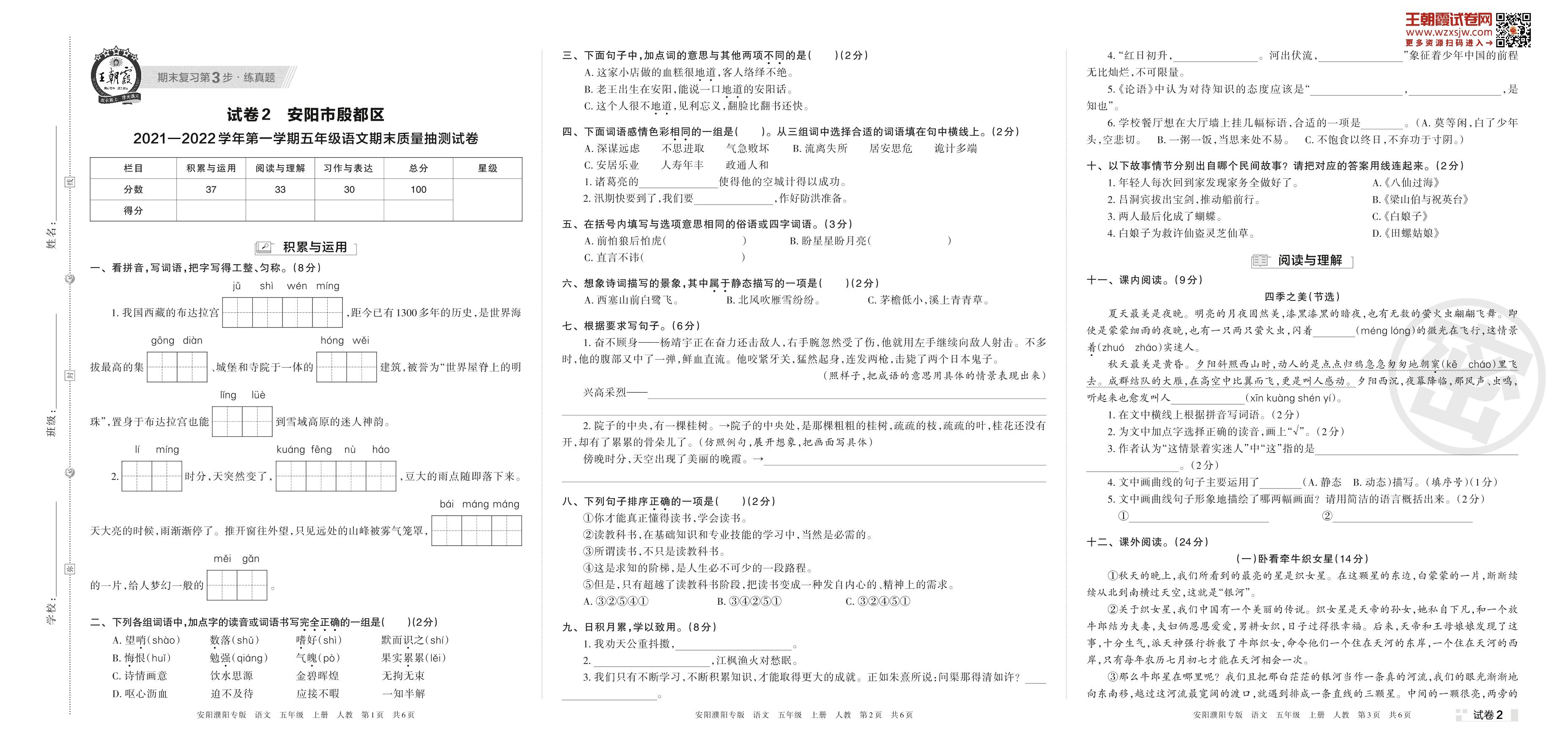 安阳市殷都区2021—2022学年第一学期五年级语文期末质量抽测试卷(人教版)【2】