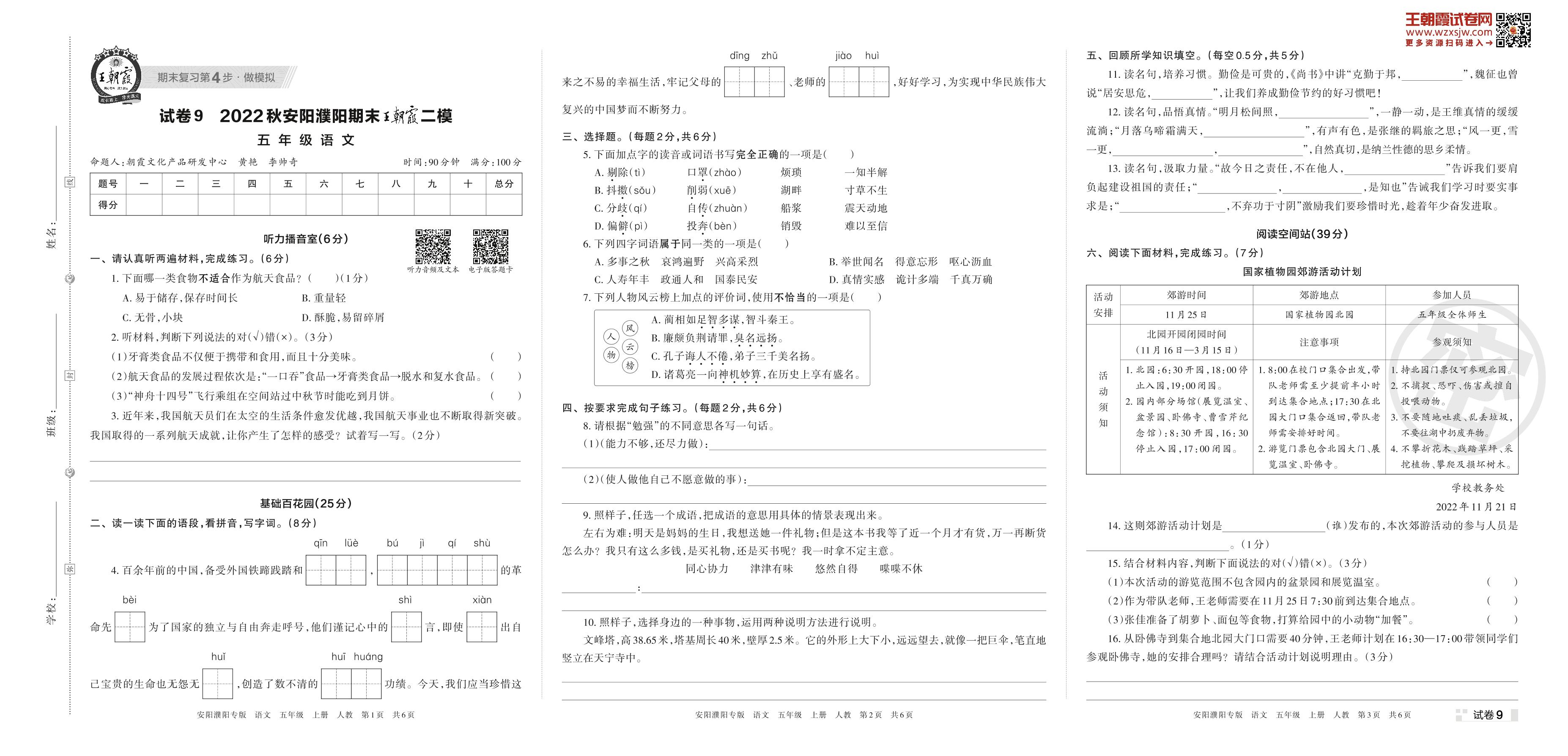 王朝霞期末模拟卷五年级上册语文(人教版)_R221116171726119【9】