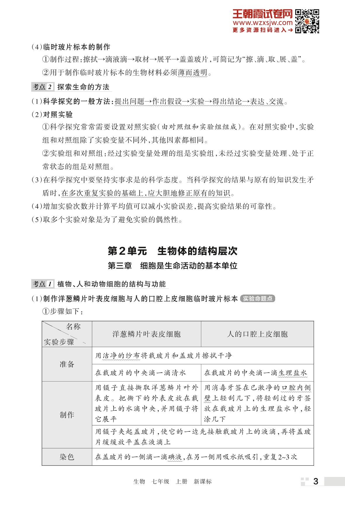王朝霞期末过课本——第2单元 生物体的结构层次七年级上册生物(新课标版)