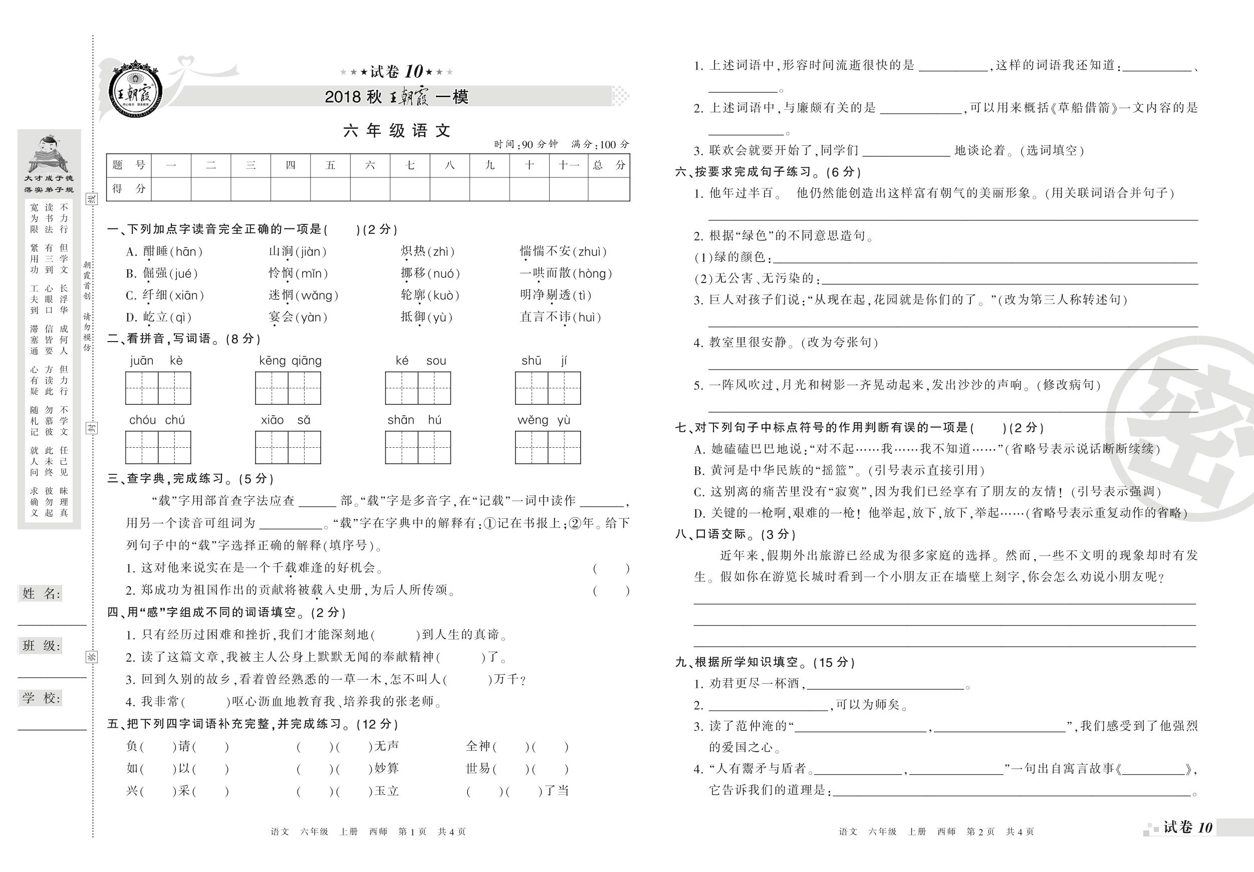 王朝霞期末模拟卷六年级上册语文(西师版)【10】