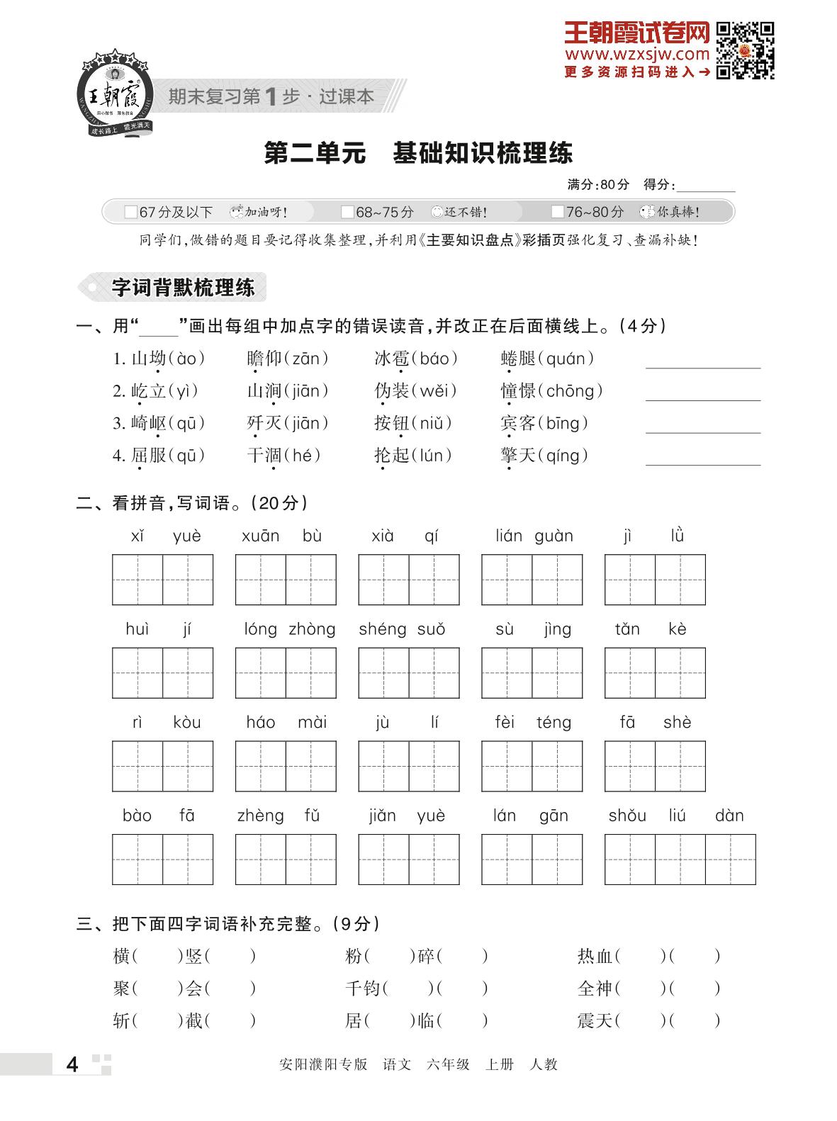 王朝霞期末过课本——第二单元 基础知识梳理练六年级上册语文(人教版)_R221116172936406