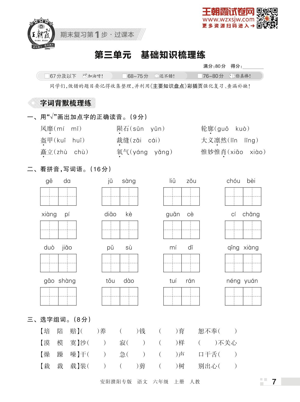 王朝霞期末过课本——第三单元 基础知识梳理练六年级上册语文(人教版)_R221116172937251
