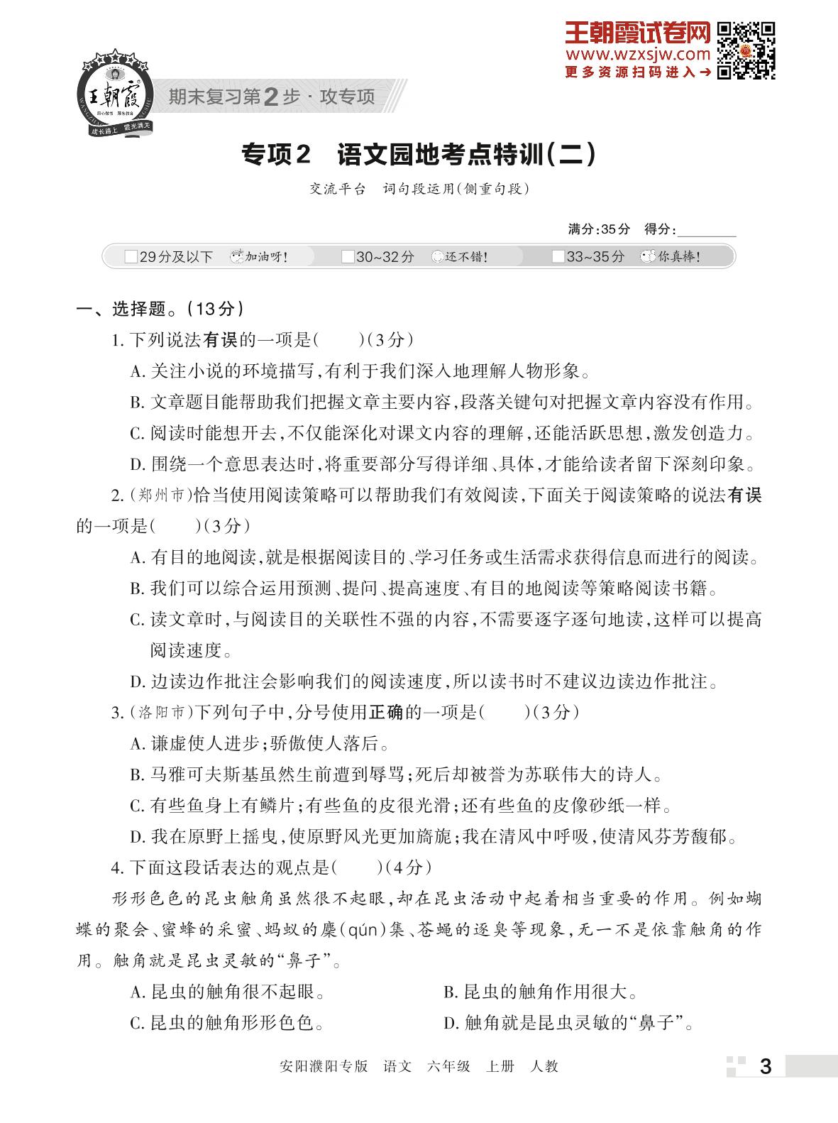 王朝霞期末专项卷——语文园地考点特训(二)六年级上册语文(人教版)_R221116172937290【2】