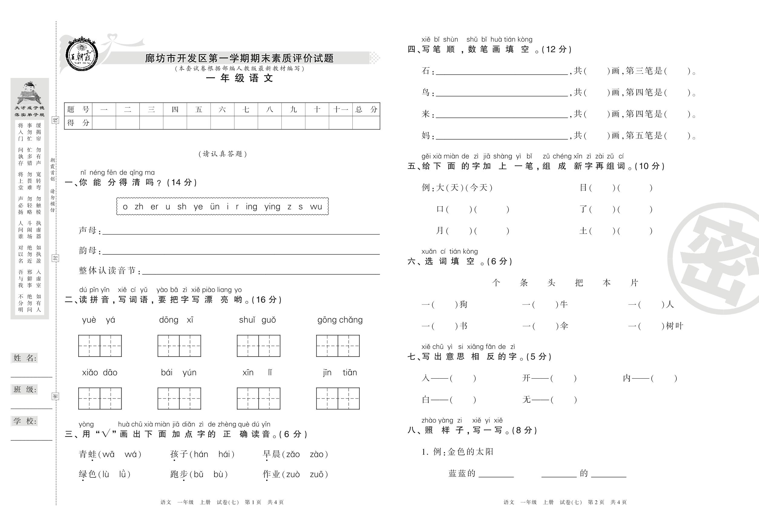 2016-2017学年第一学期廊坊市开发区一年级语文试卷(人教版)【7】