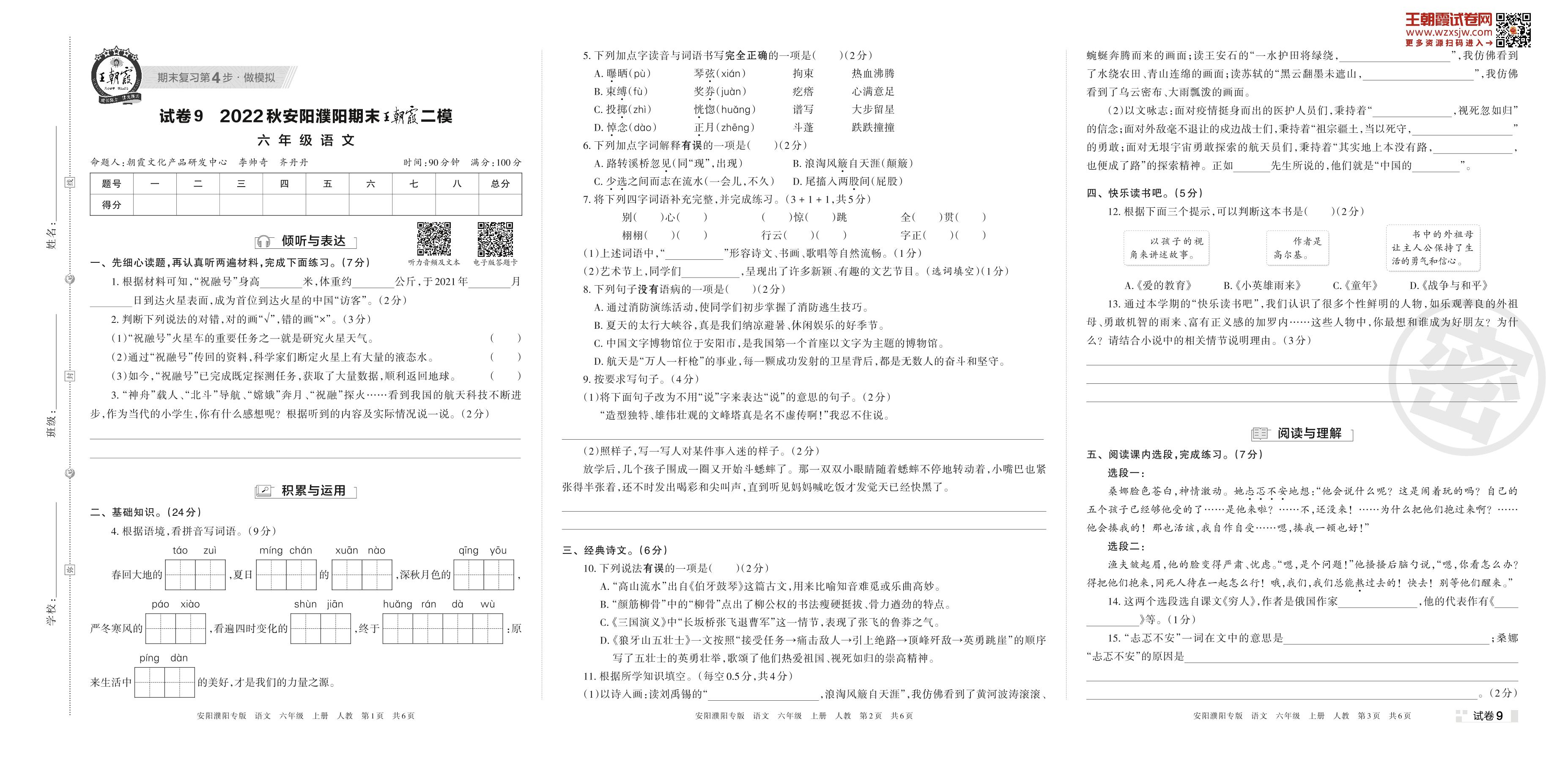 王朝霞期末模拟卷六年级上册语文(人教版)_R221116172939157【9】