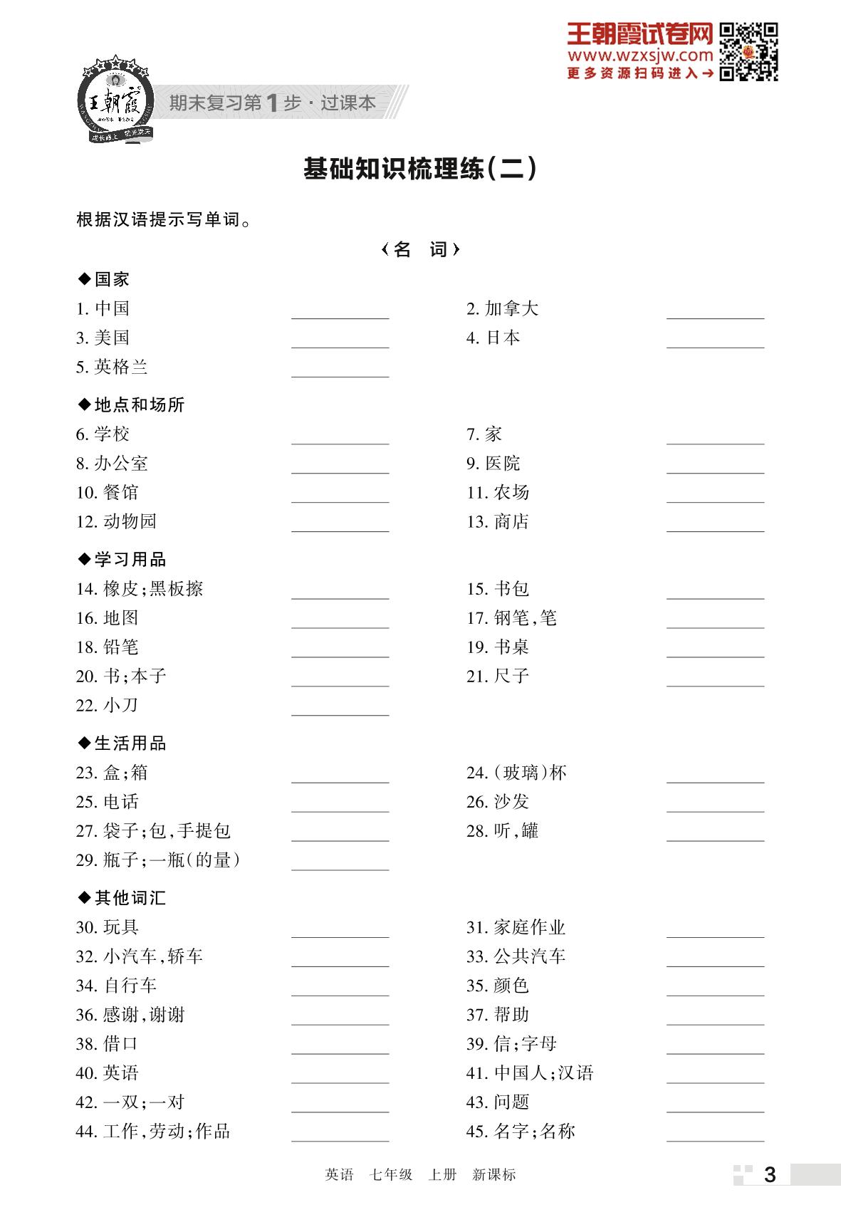 王朝霞期末过课本——基础知识梳理练(二)七年级上册英语(新课标版)