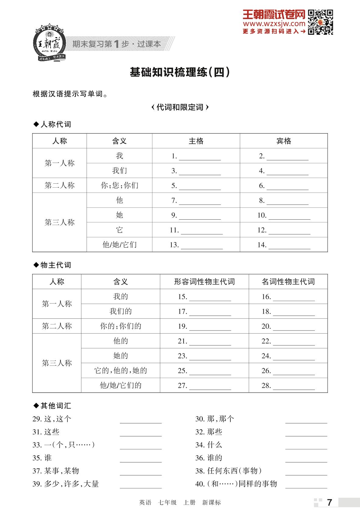 王朝霞期末过课本——基础知识梳理练(四)七年级上册英语(新课标版)
