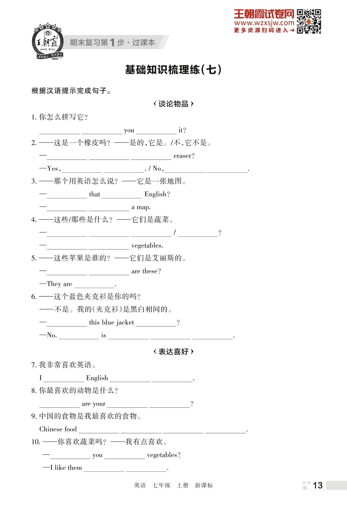 王朝霞期末过课本——基础知识梳理练(七)七年级上册英语(新课标版)