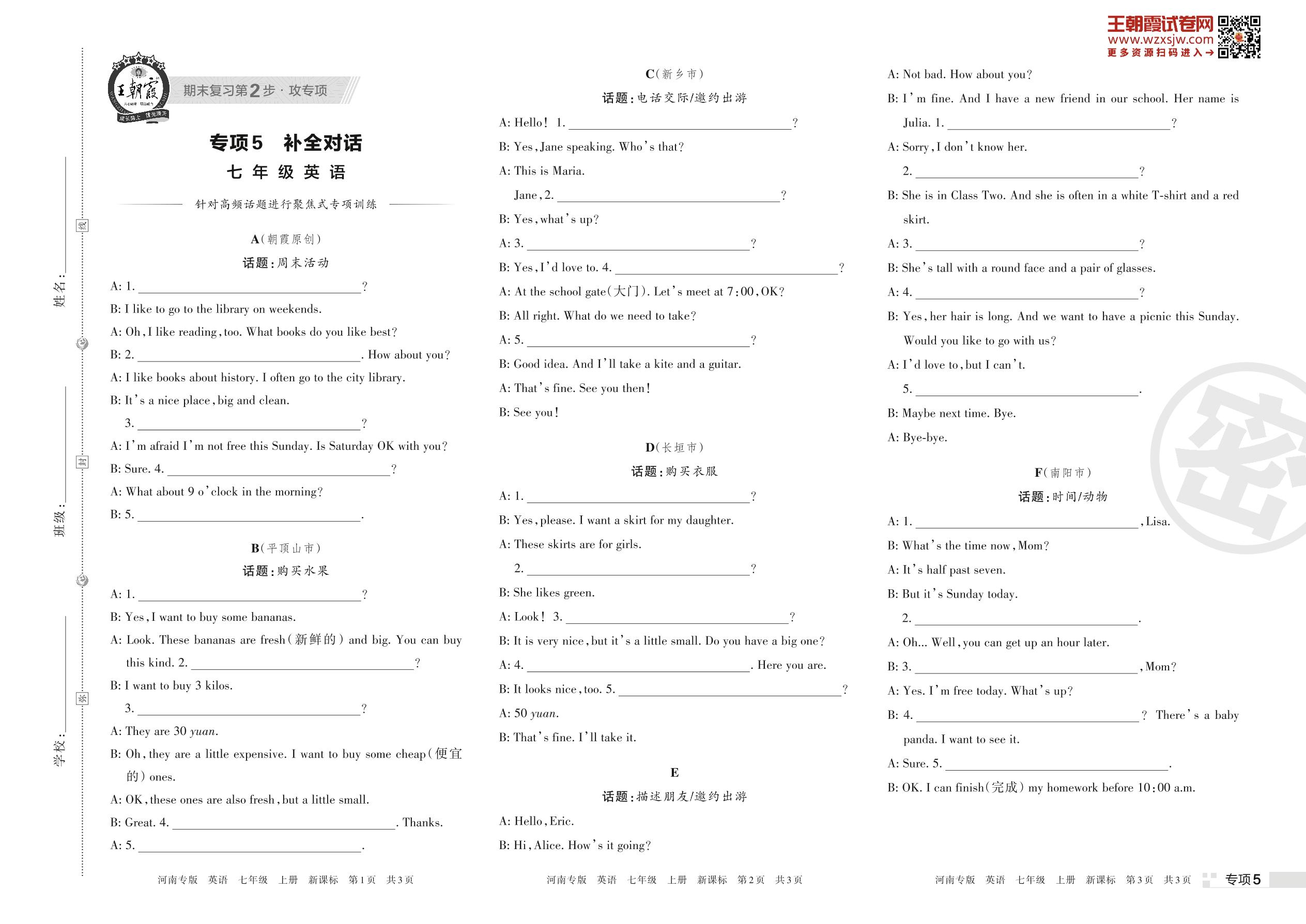 王朝霞期末专项卷——补全对话七年级上册英语(新课标版)【5】