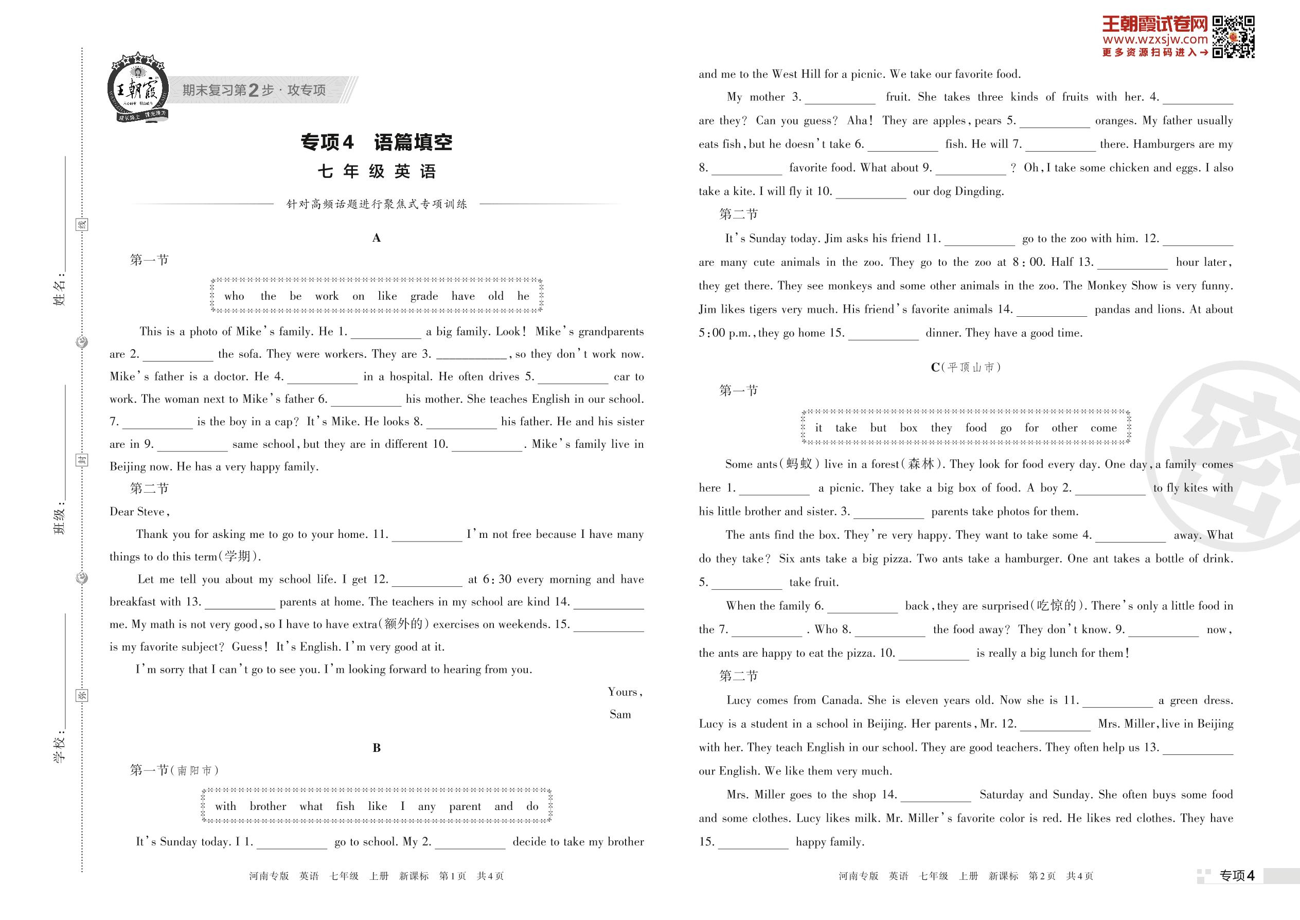 王朝霞期末专项卷——语篇填空七年级上册英语(新课标版)【4】