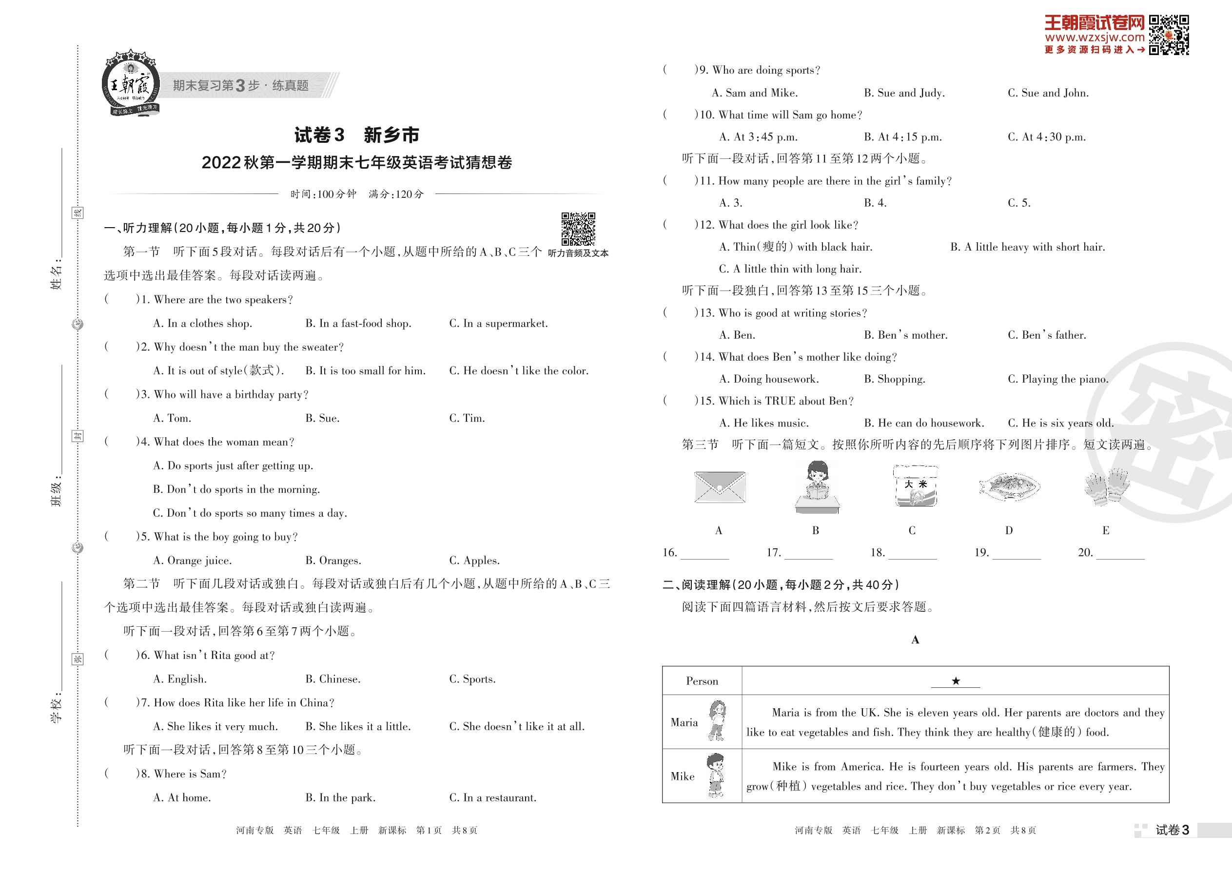 新乡市2022秋第一学期期末七年级英语考试猜想卷(新课标版)【3】