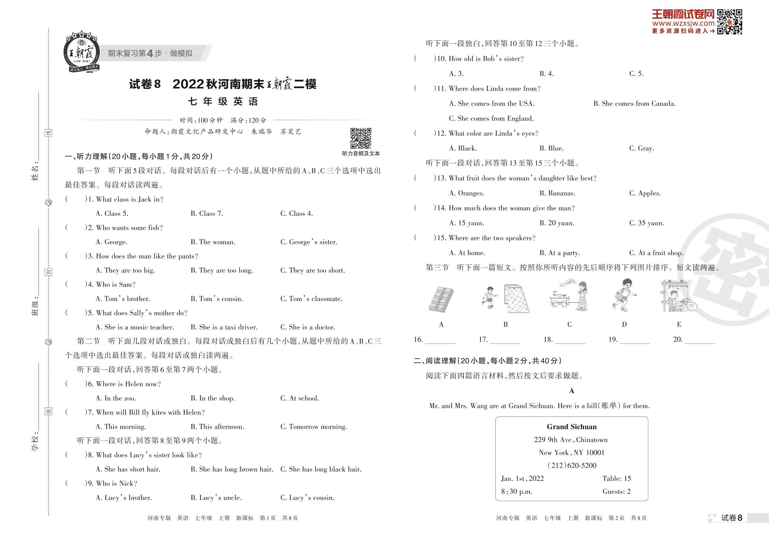 王朝霞期末模拟卷七年级上册英语(新课标版)【8】