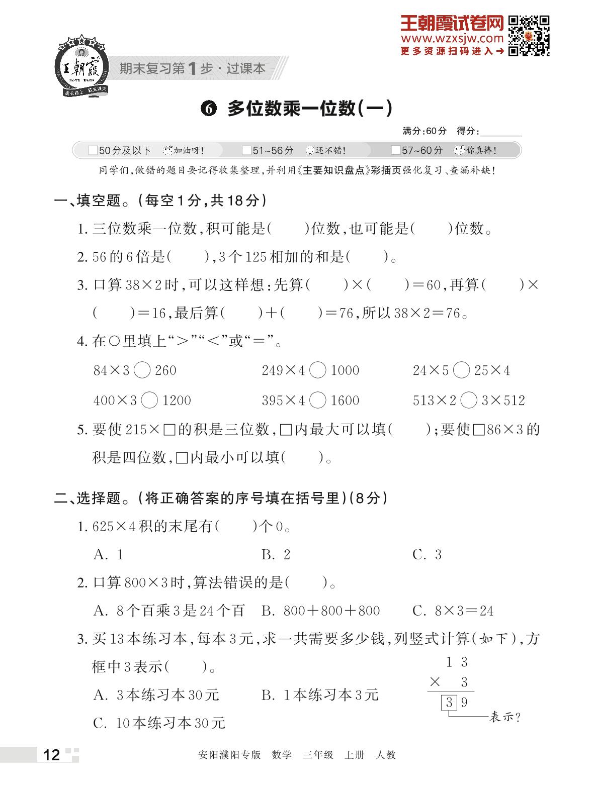 王朝霞期末过课本——6 多位数乘一位数(一)三年级上册数学(人教版)_R221116173639808