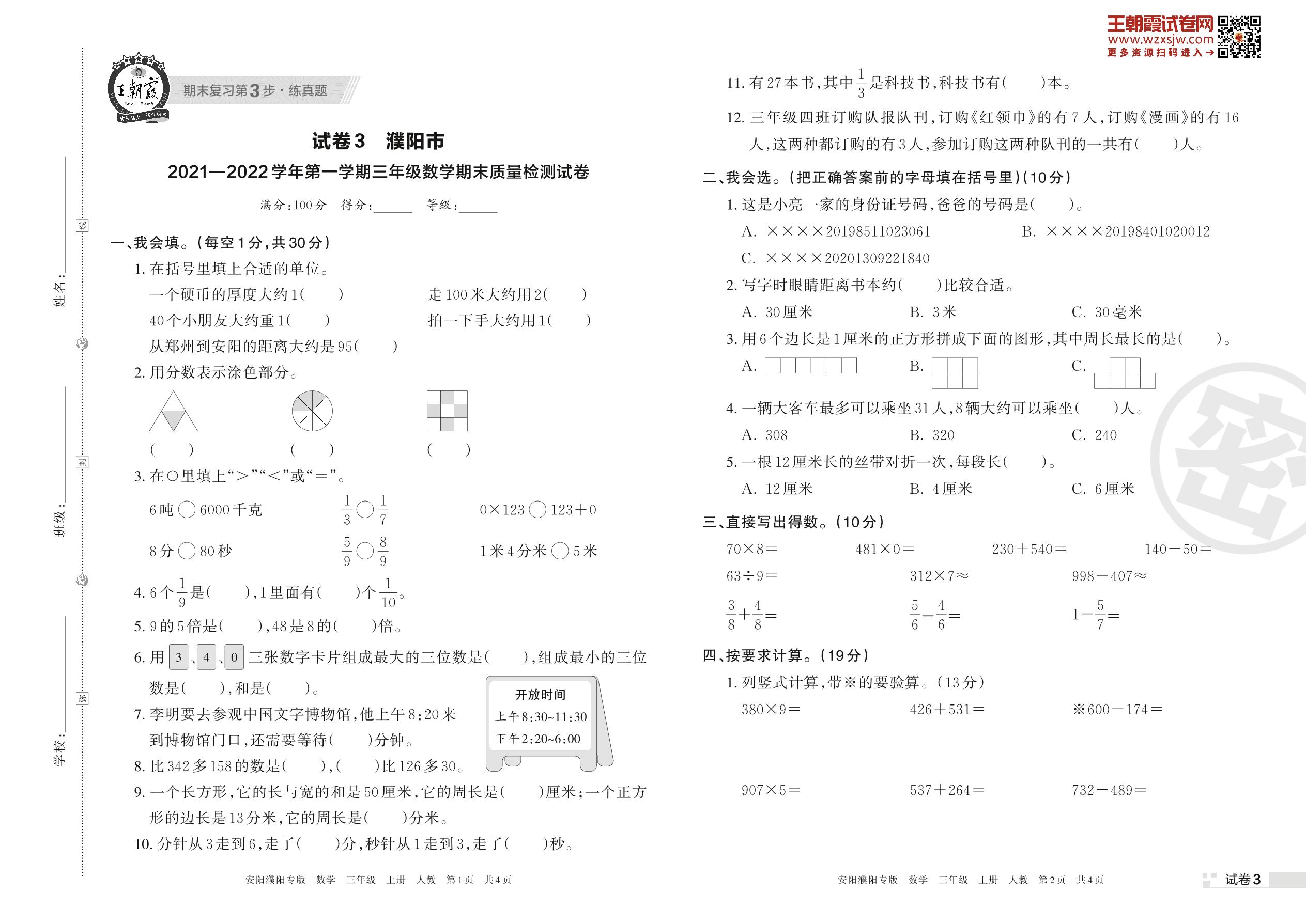 濮阳市2021—2022学年第一学期三年级数学期末质量检测试卷(人教版)【3】
