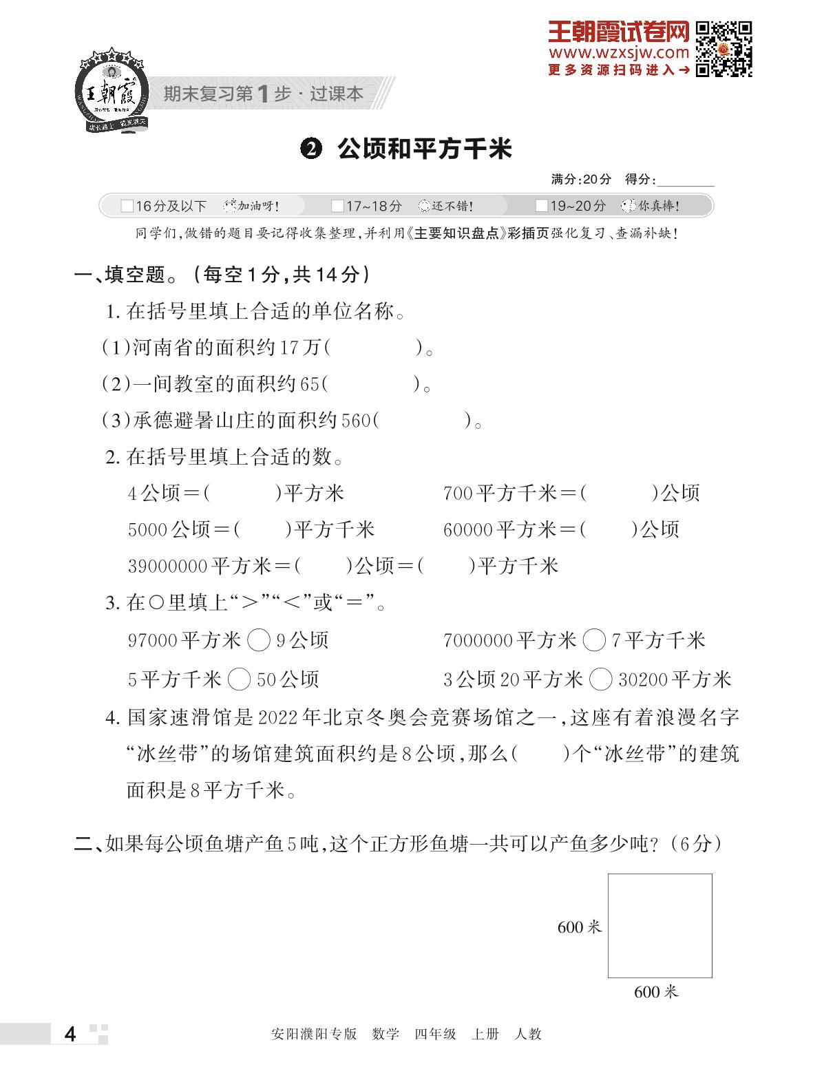 王朝霞期末过课本——2 公顷和平方千米四年级上册数学(人教版)_R221116174344923