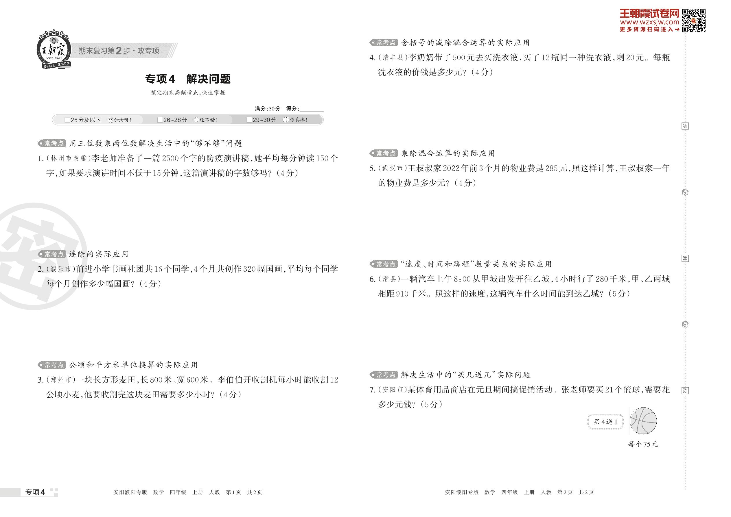 王朝霞期末专项卷——解决问题四年级上册数学(人教版)_R221116174345968【4】