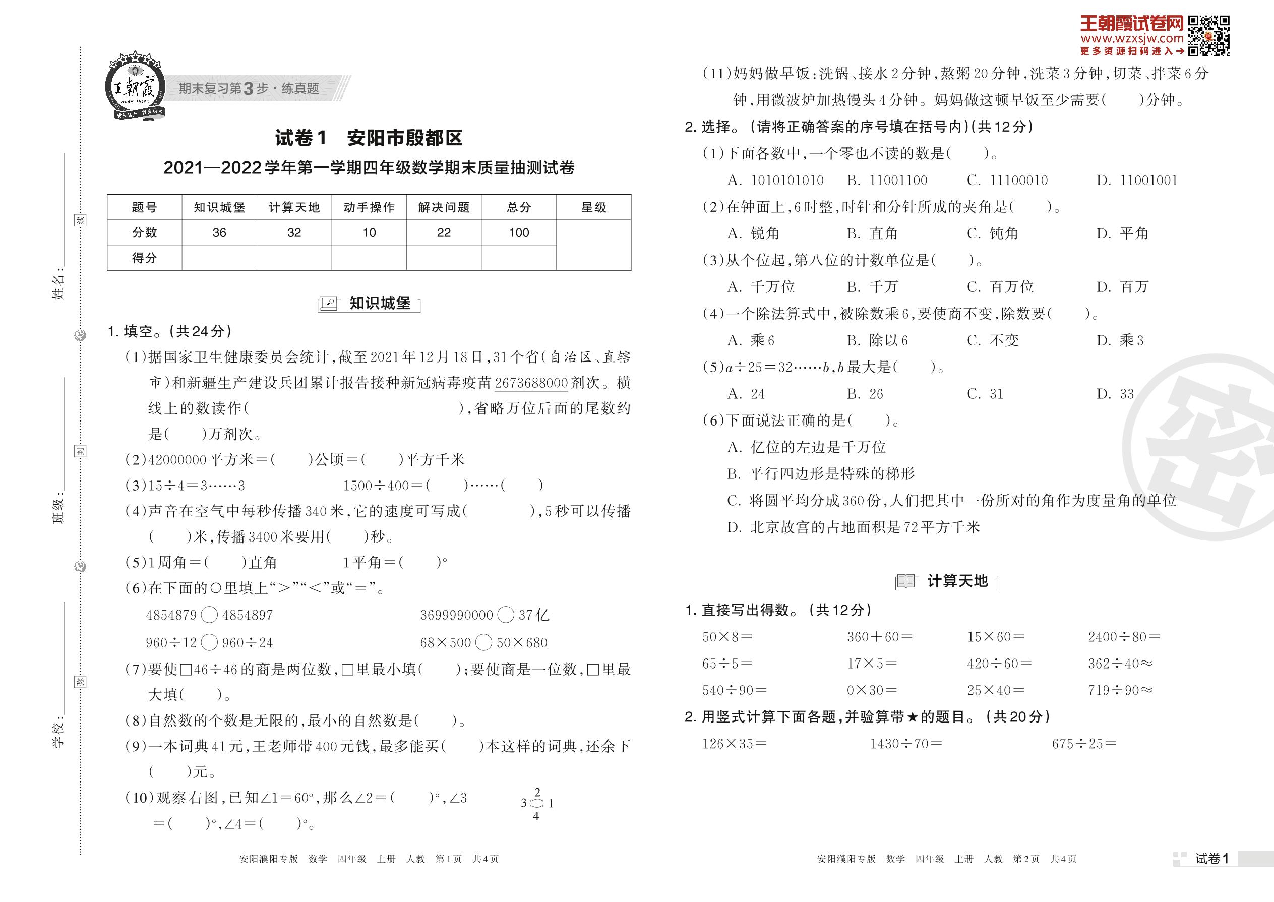 安阳市殷都区2021—2022学年第一学期四年级数学期末质量抽测试卷(人教版)【1】