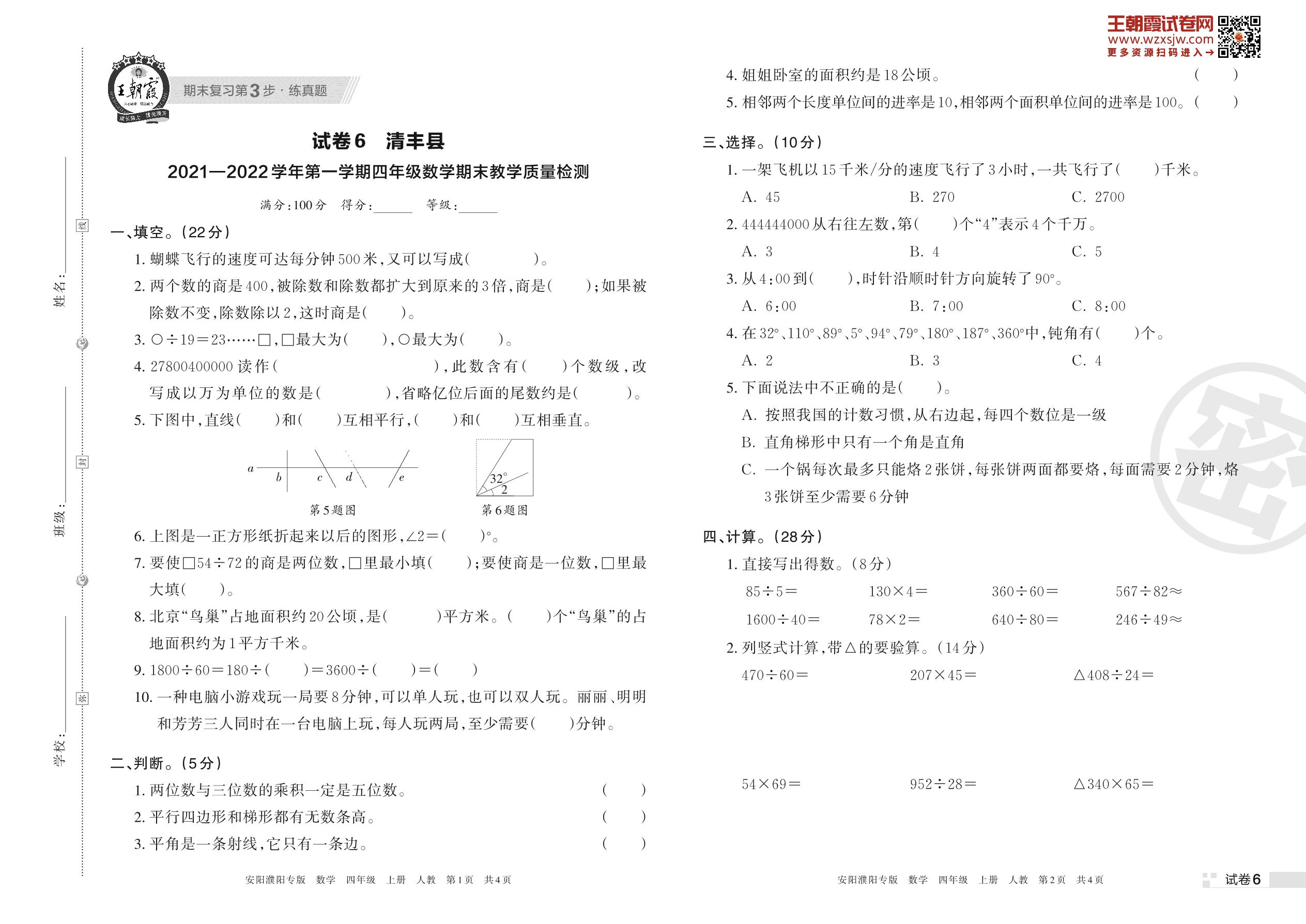清丰县2021—2022学年度第一学期四年级数学期末教学质量检测(人教版)【6】