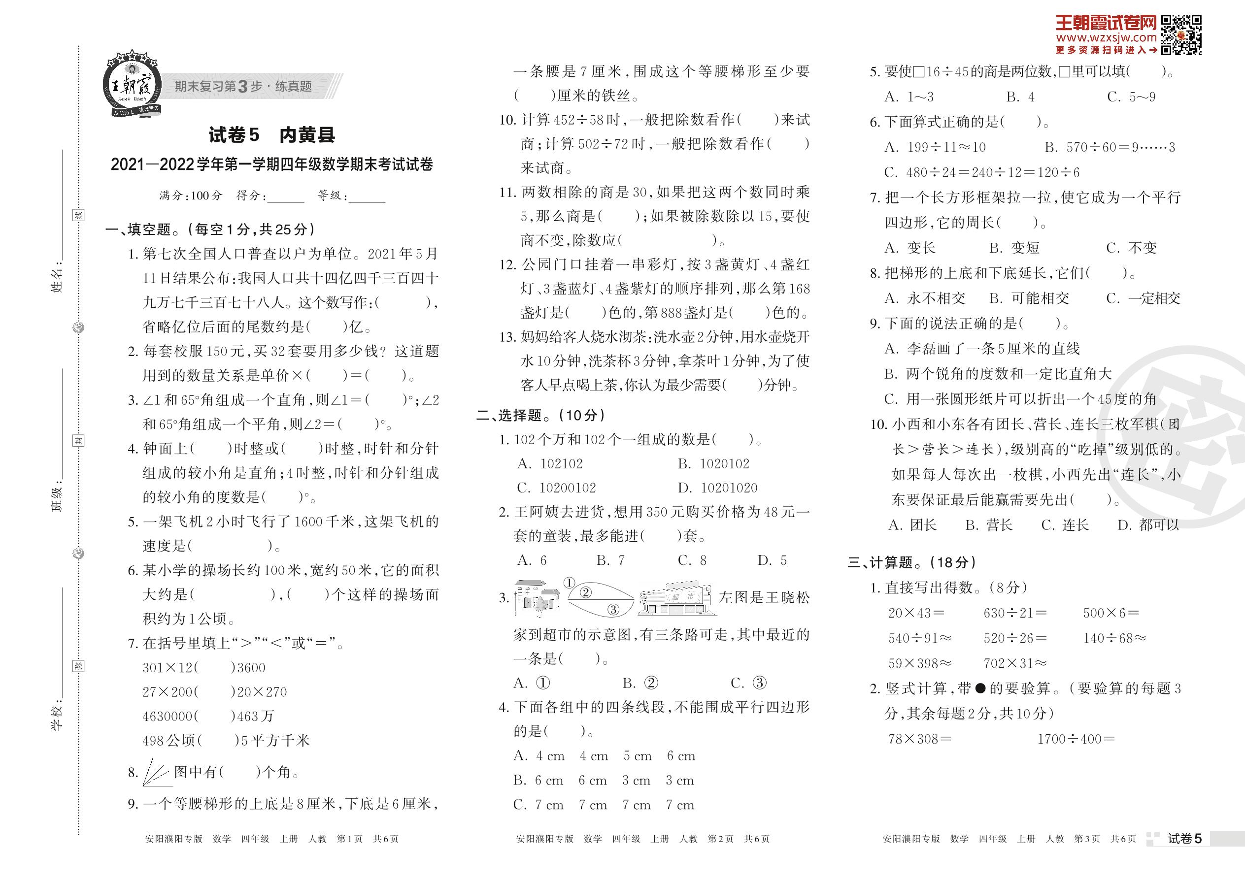 内黄县2021—2022学年上学期四年级数学期末考试试卷(人教版)【5】