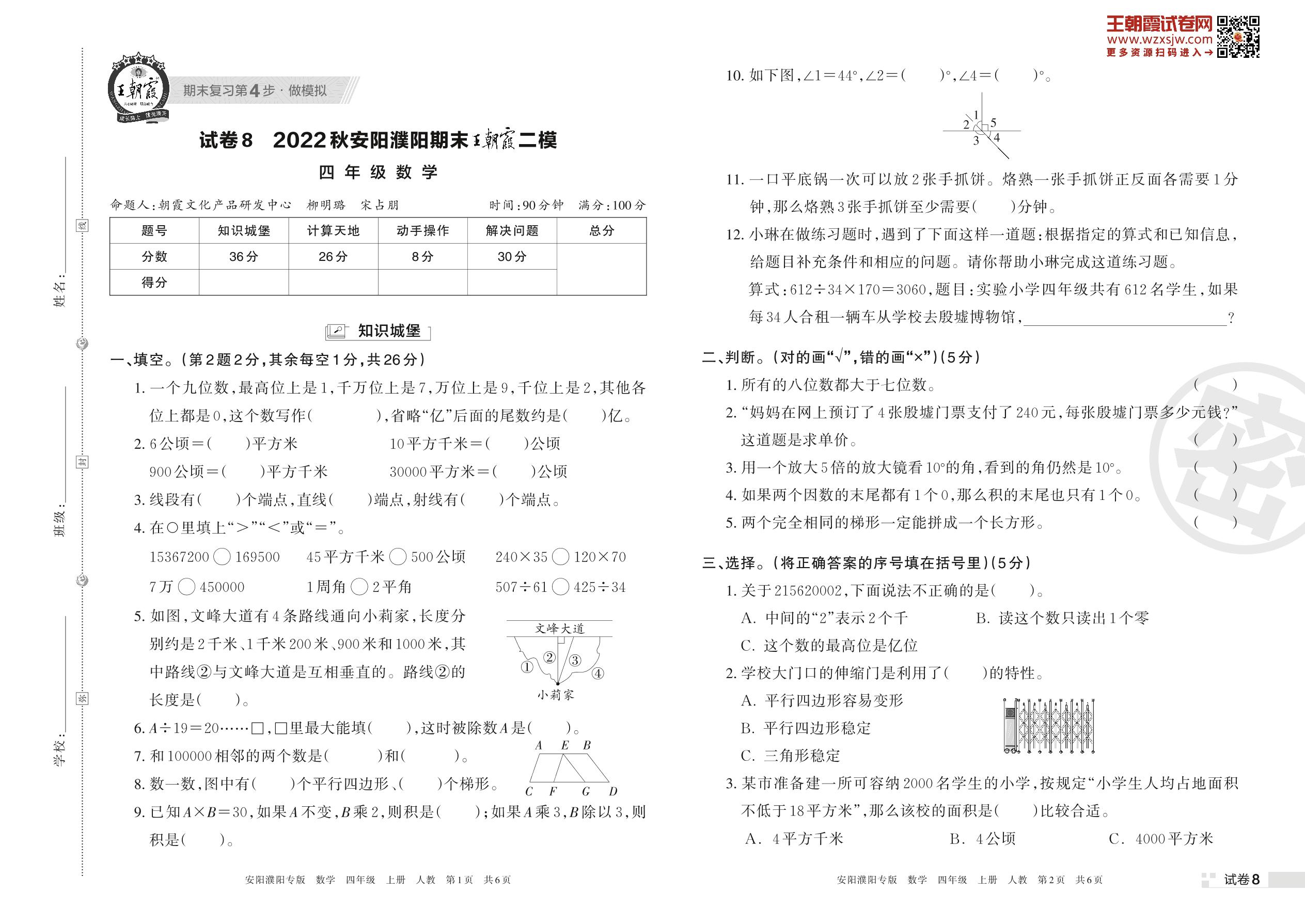 王朝霞期末模拟卷四年级上册数学(人教版)_R221116174347614【8】