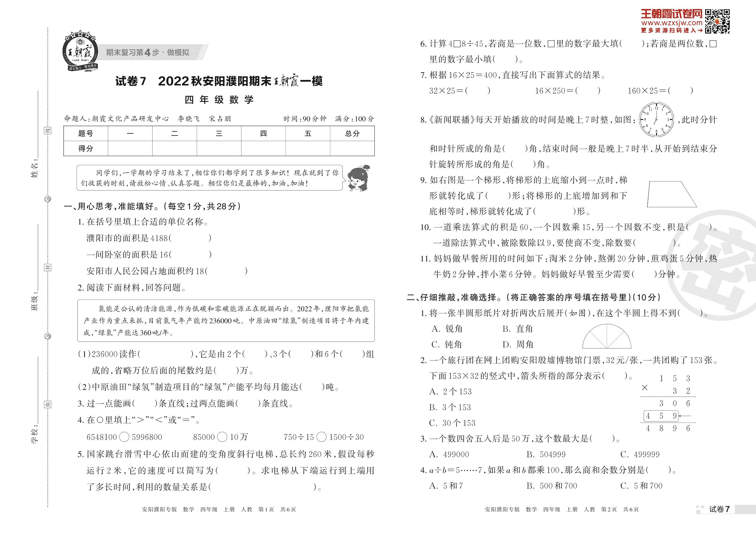 王朝霞期末模拟卷四年级上册数学(人教版)_R221116174347780【7】